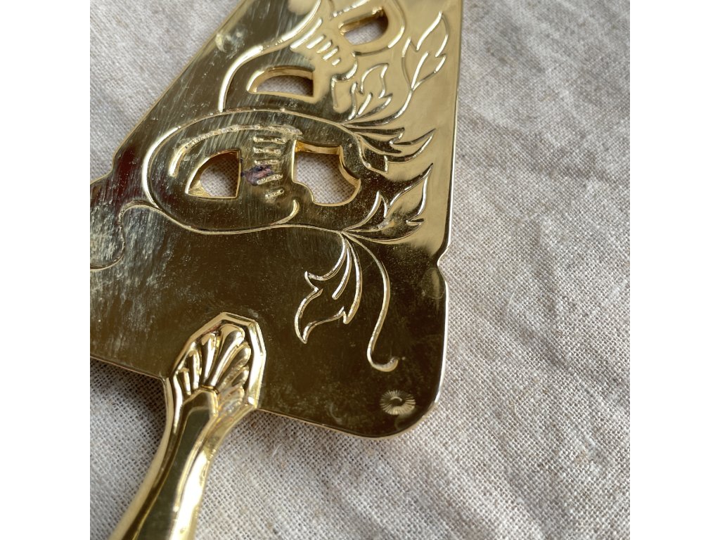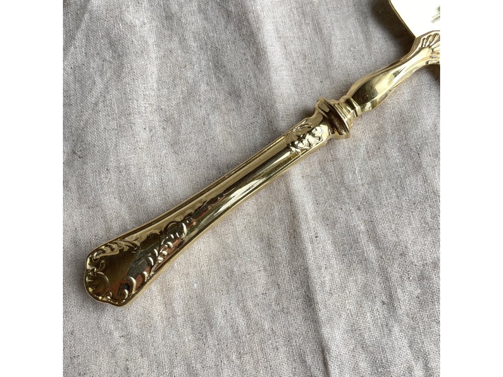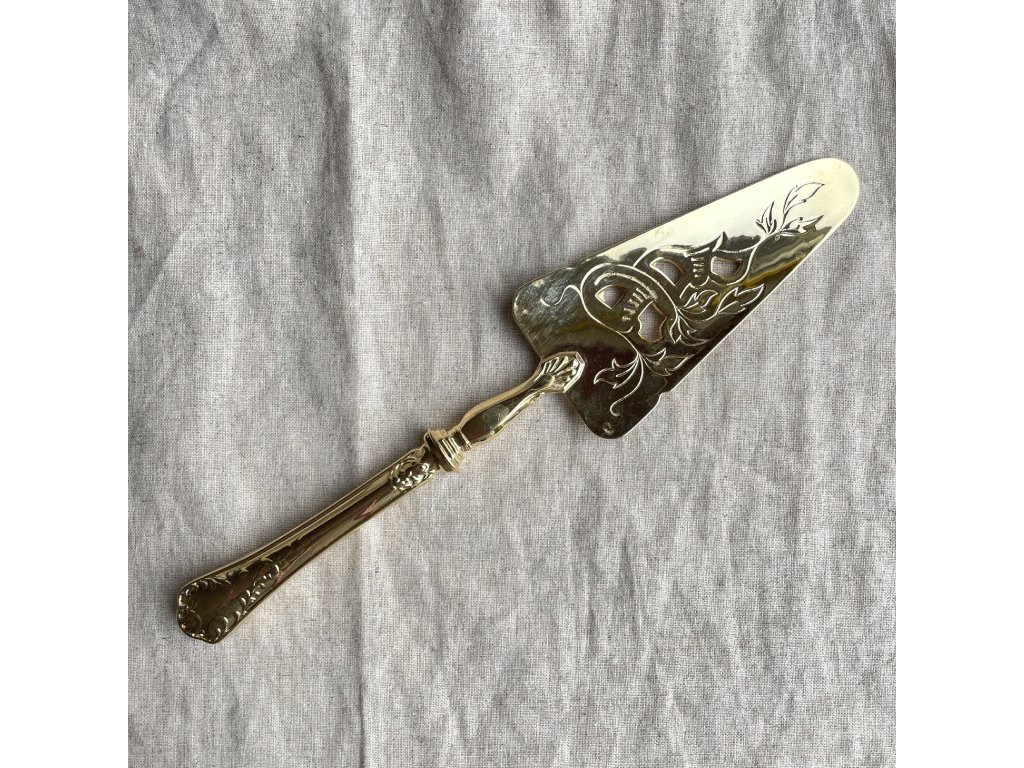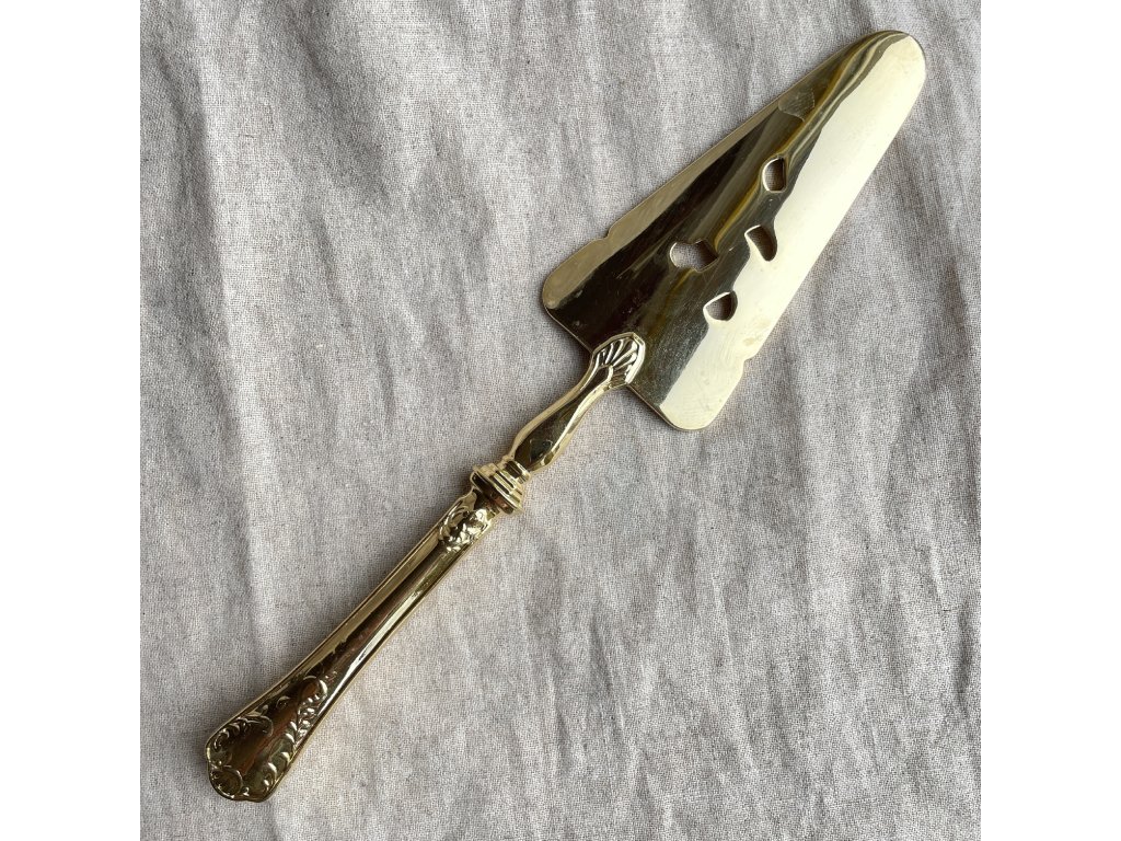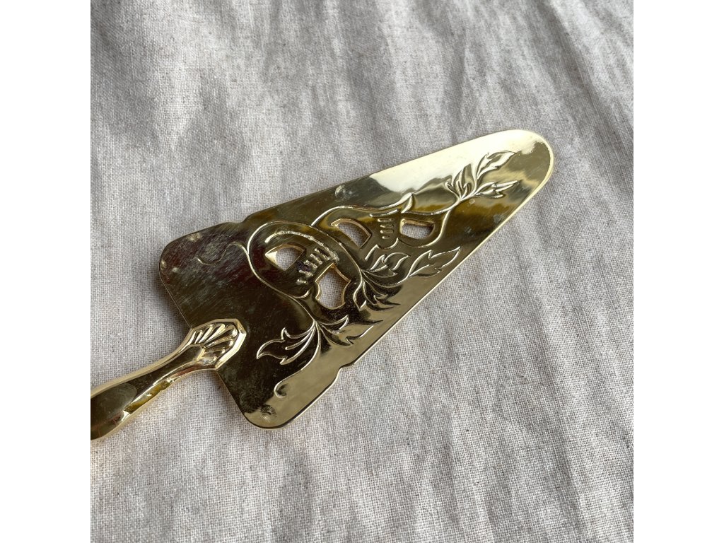 Lopatka na zákusky je elegantní servírovací náčiní vyrobené z kovu se zlatavým lesklým povrchem.