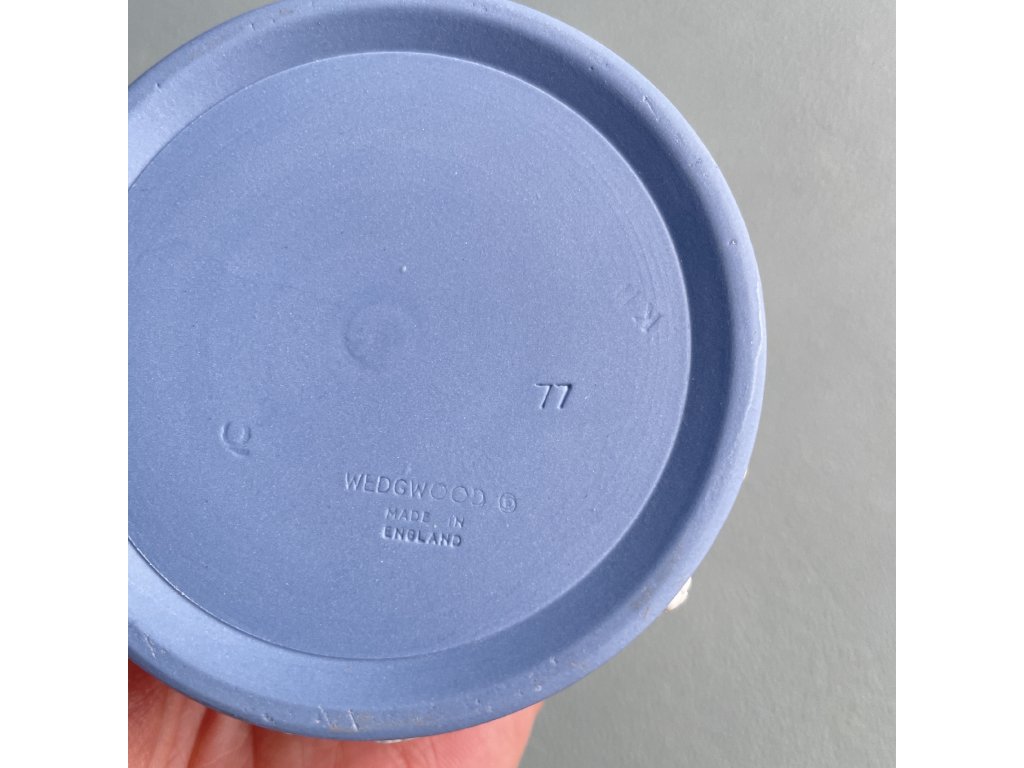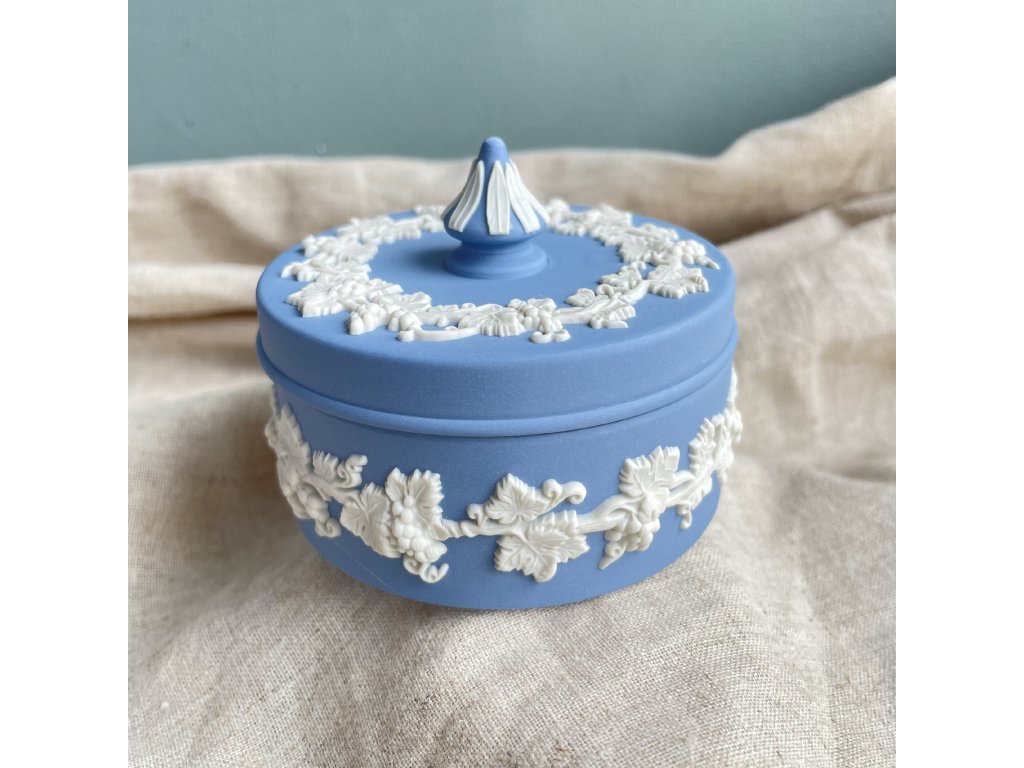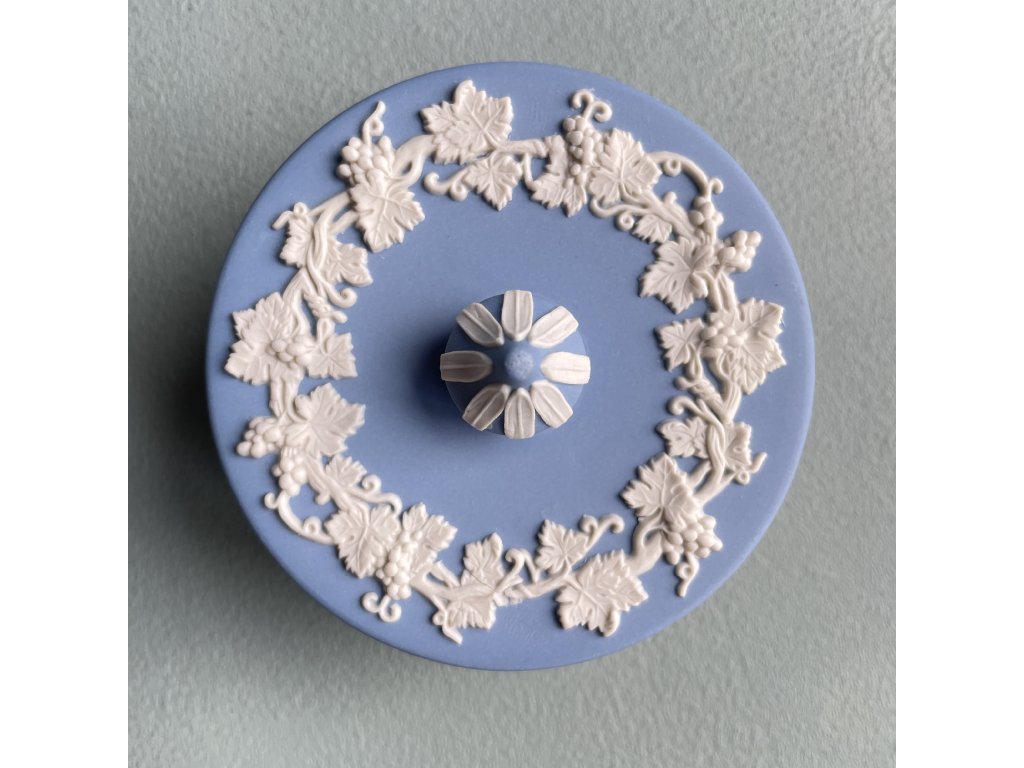 Dekorativní dóza s víčkem je vyrobena z jemného kameninového materiálu známého jako "jasperware", typického pro anglickou značku Wedgwood.