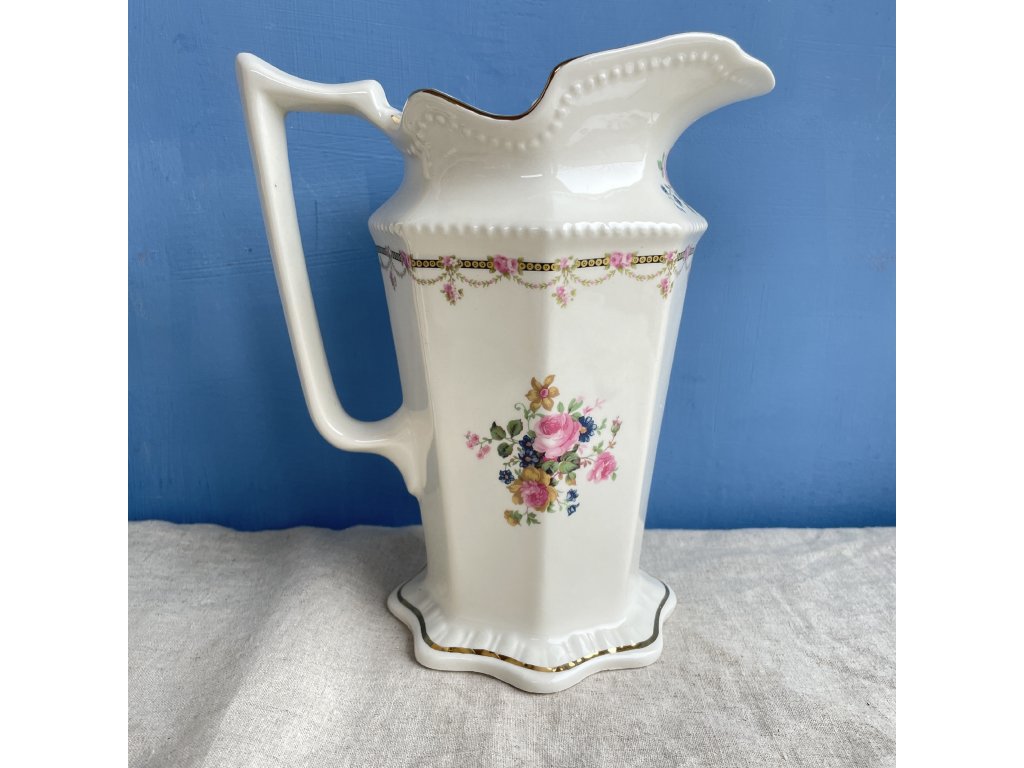 Porcelánový džbán zaujme svým elegantním, štíhlým tvarem s výrazně tvarovaným hrdlem a pevnou hranatou nohou, které mu dodávají dekorativní a zároveň stabilní charakter.