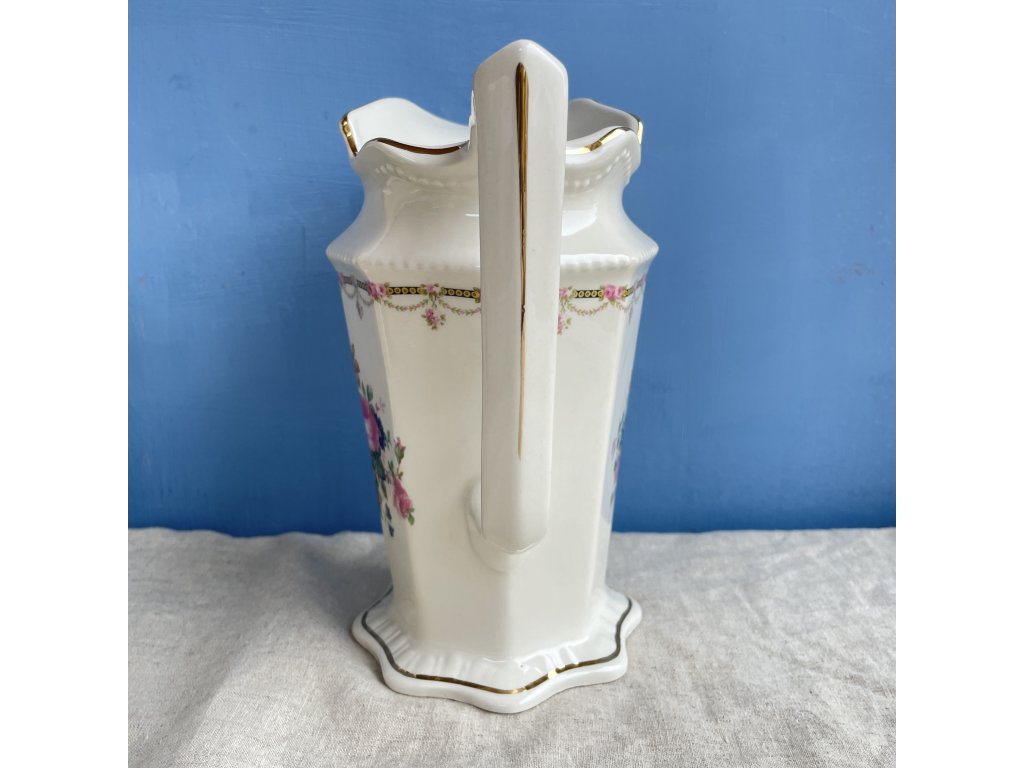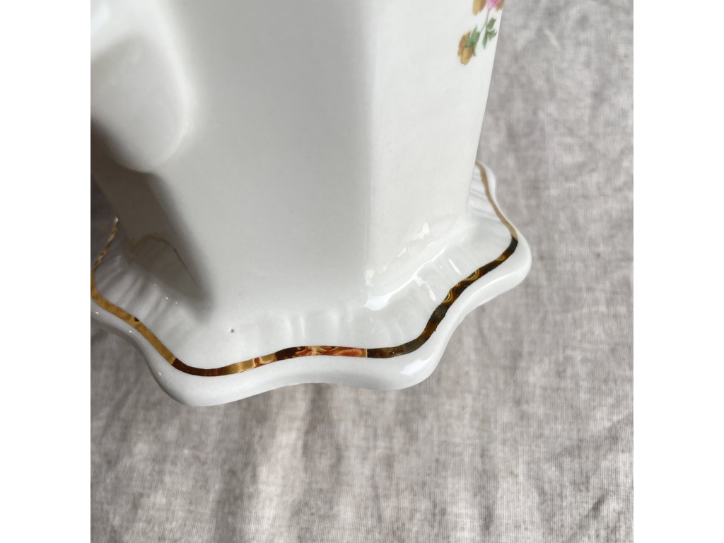 Smetanové porcelánové tělo je zdobeno jemným květinovým dekorem v růžových, modrých a žlutých tónech, doplněným drobnou květinovou girlandou pod okrajem.