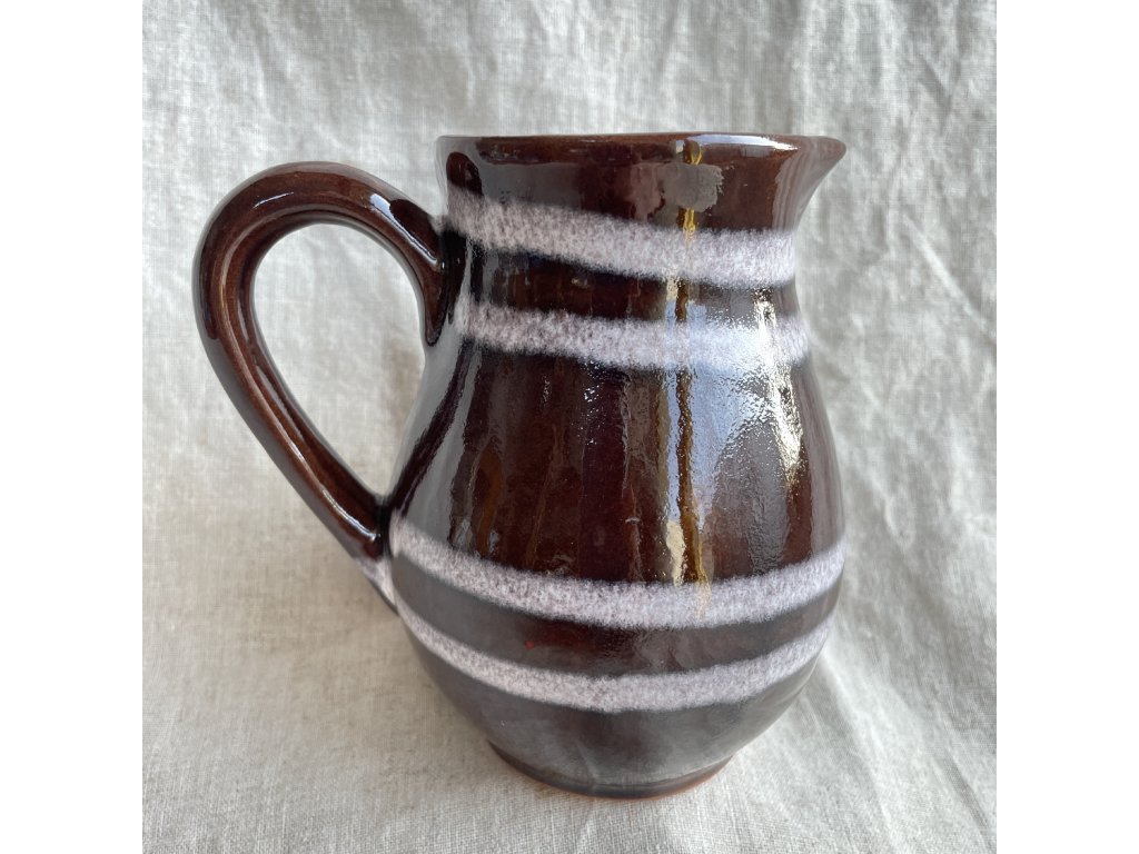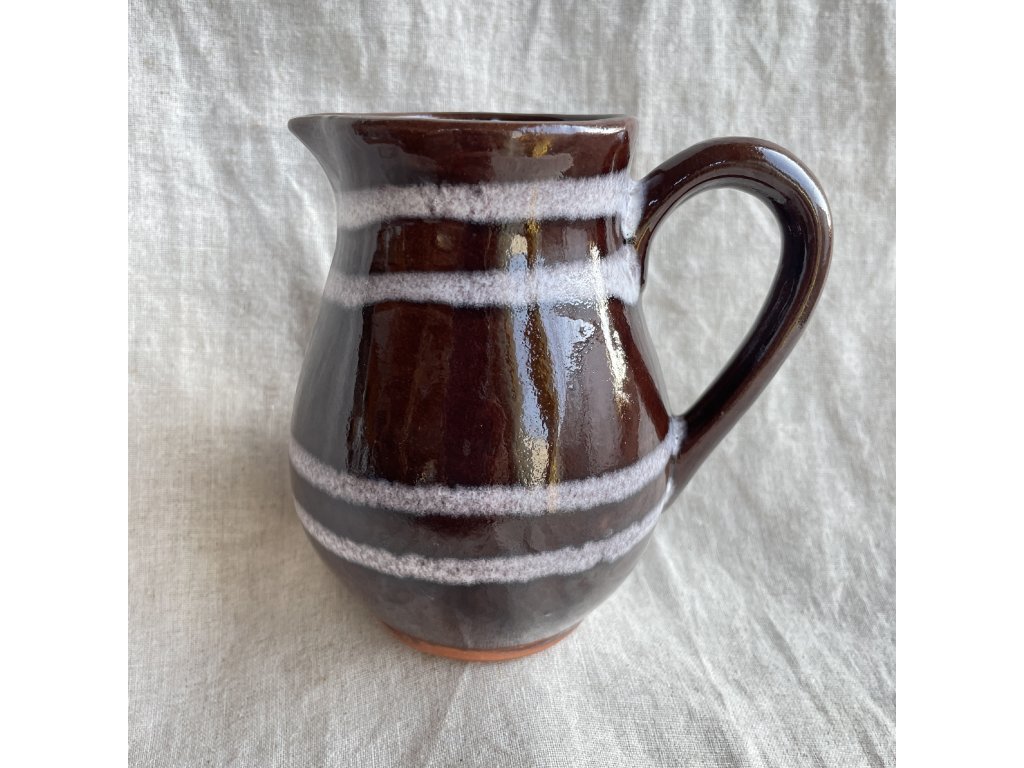 Dekor tvoří několik horizontálních pruhů ve světlejší, jemně pěnivé glazuře, které kontrastují s tmavým podkladem a dodávají džbánku typický dobový charakter.