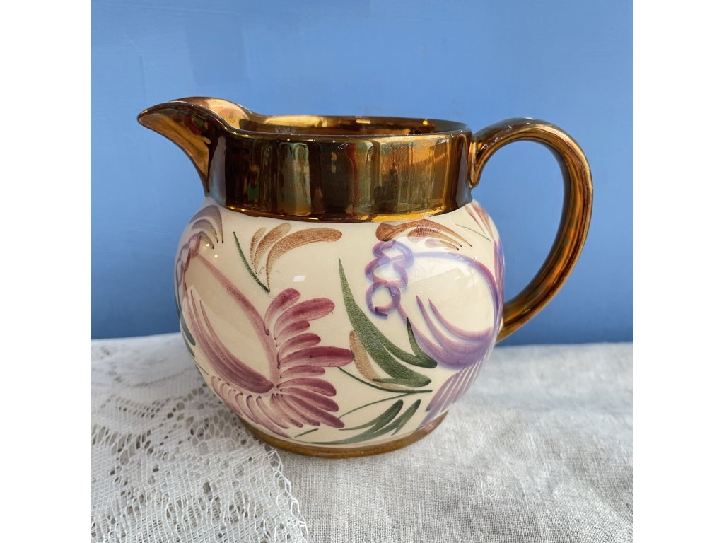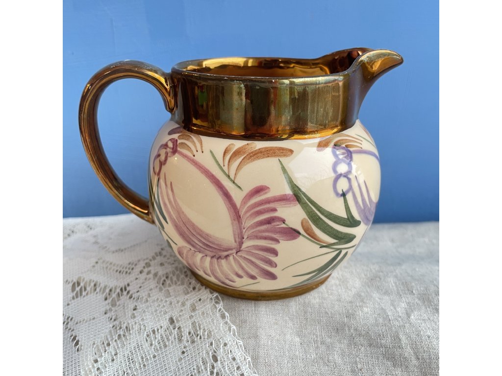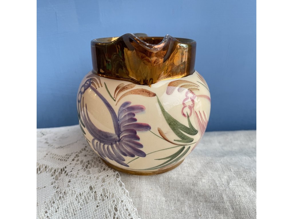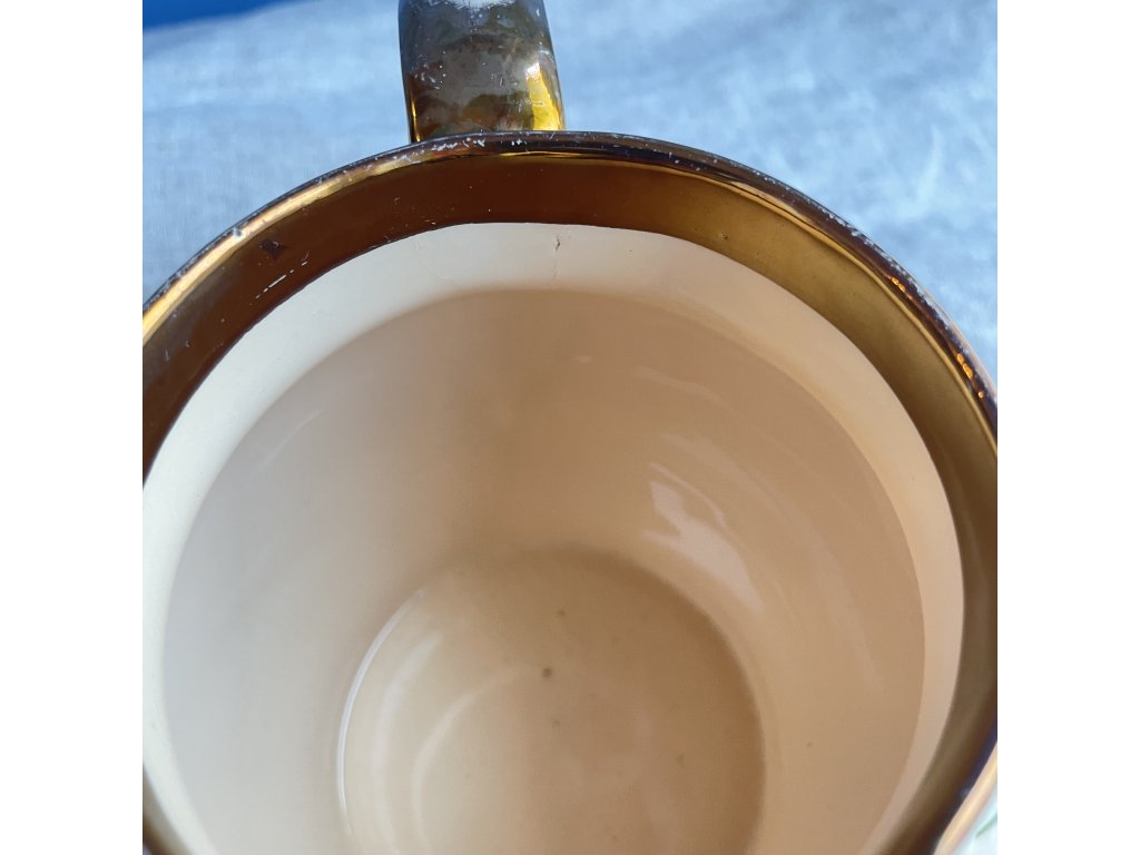 Horní okraj je opatřen hnědavě zlatou lesklou glazurou, která plynule přechází do krémově světlého těla džbánku a vytváří příjemný kontrast k malovanému dekoru.