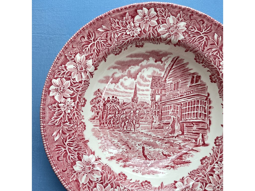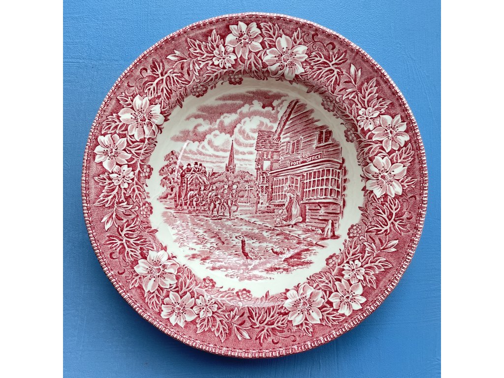 Hluboký talíř z anglické kameniny s výrazným červeným transferovým dekorem.