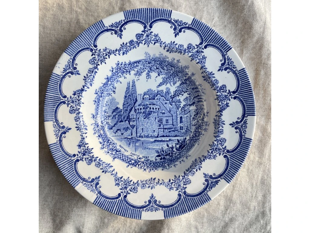 Hluboký talíř je vyroben z kameniny (ironstone china) a pochází z anglické produkce, jak napovídá reliéfní značení na spodní straně English Ironstone Tableware Ltd.