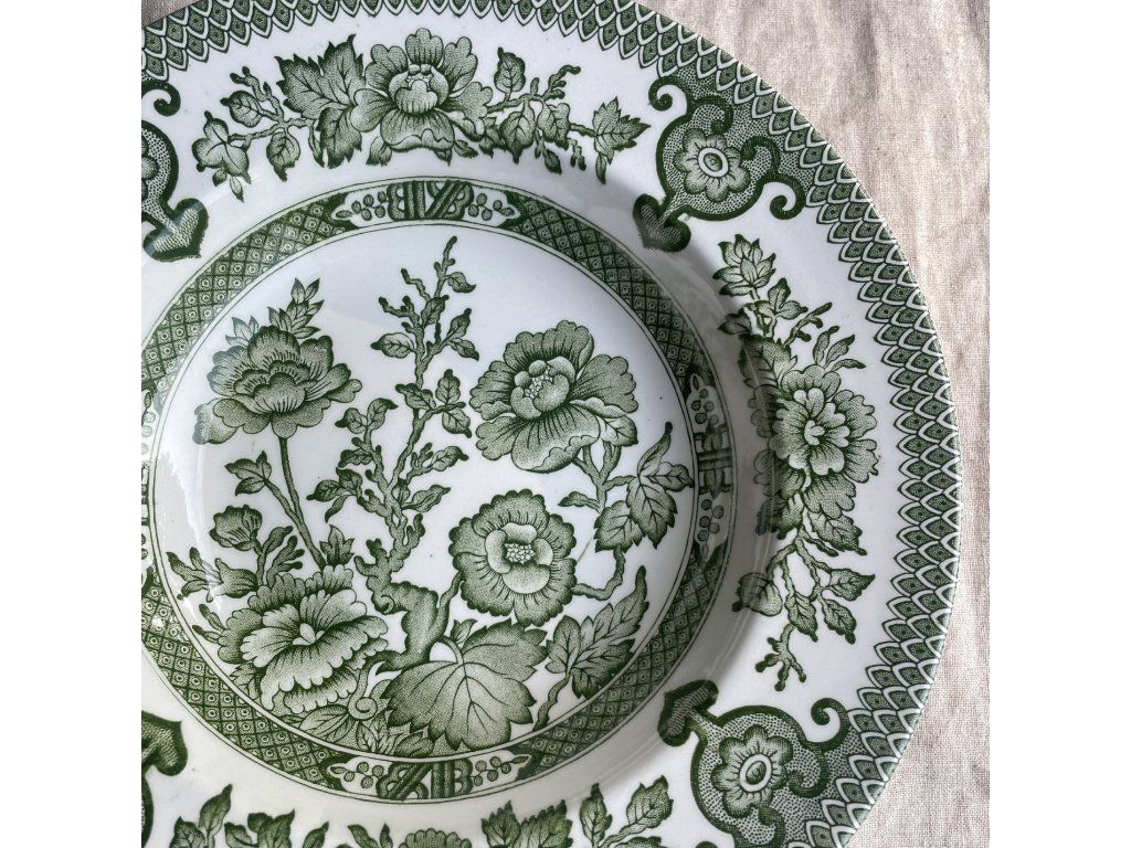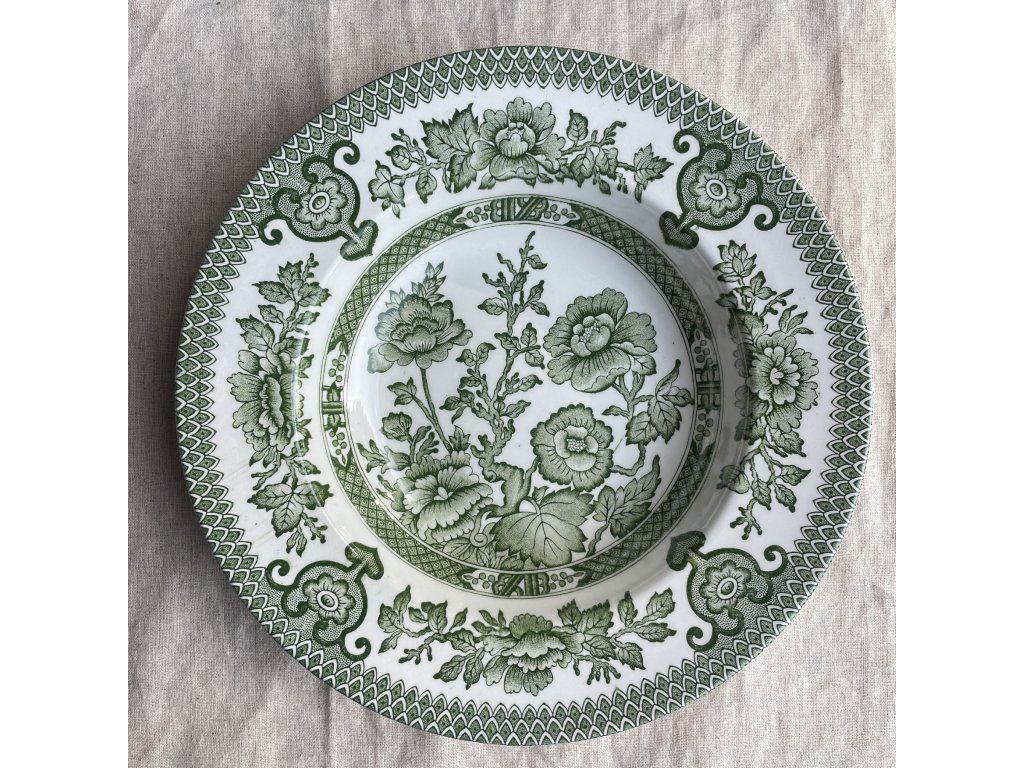 Hluboký talíř je vyroben z anglické kameniny typu ironstone a zdoben výrazným dekorativním motivem známým jako Indian Tree.