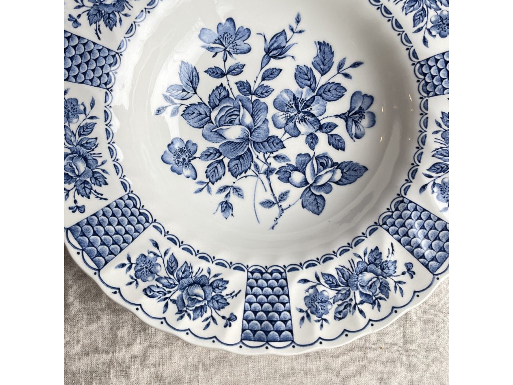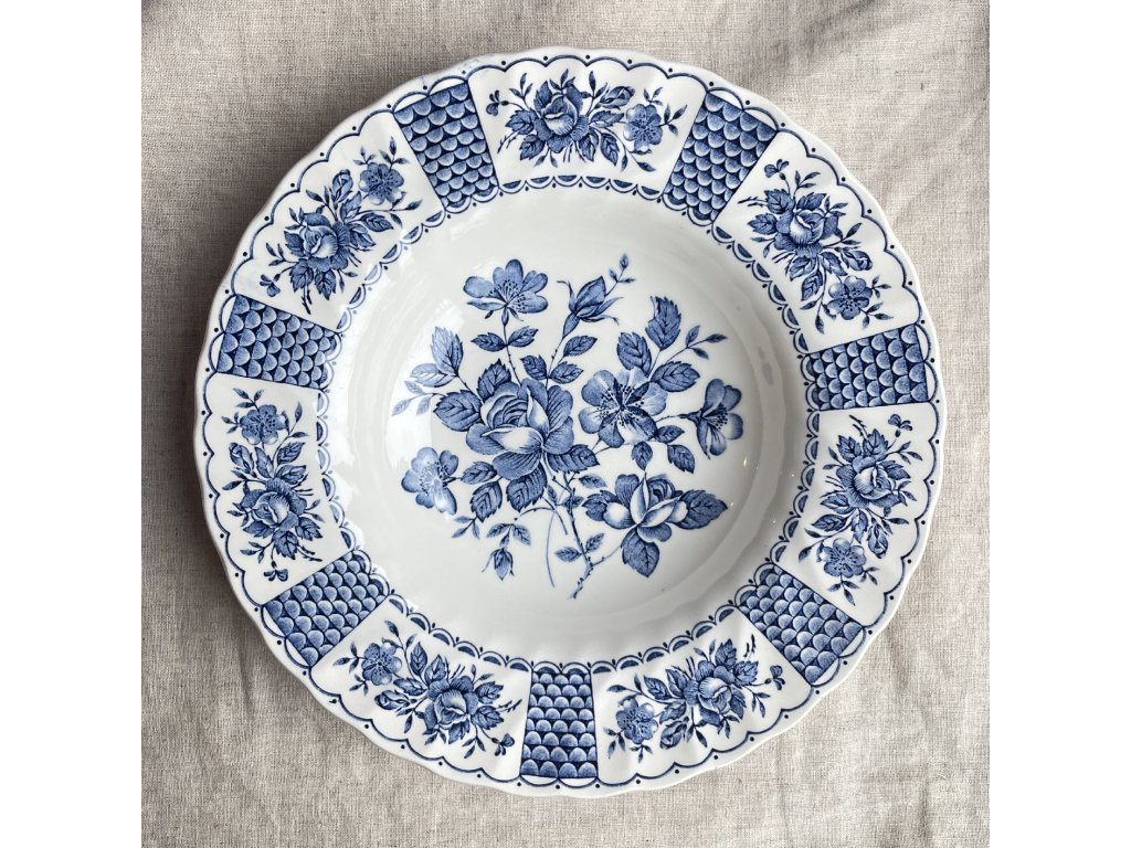 Hluboký talíř je vyroben z kvalitního anglického ironstonu a zdoben klasickým modrobílým květinovým dekorem s bohatým středovým motivem růží a jemně členěným lemem, který střídá florální panely s ornamentálním vzorem připomínajícím šupiny.