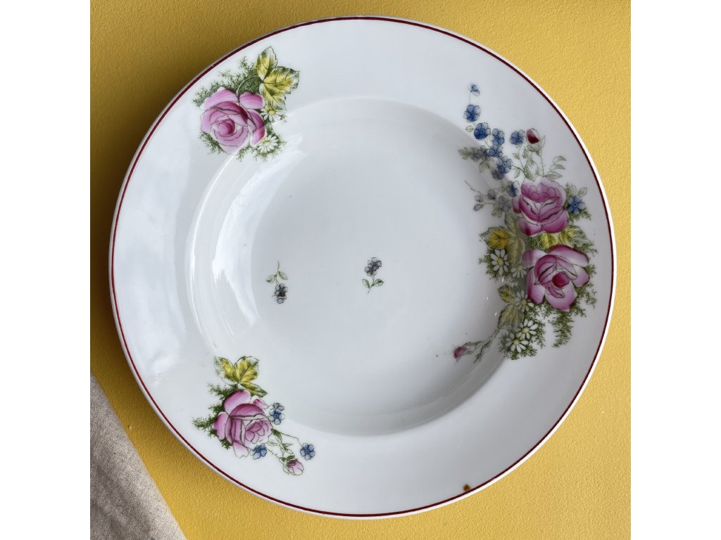 Vzhledem k jemnosti dekoru a barevné linky na okraji je vhodné šetrné zacházení, ideálně ruční mytí, aby si zachoval svůj půvab a barevnou svěžest i do budoucna.