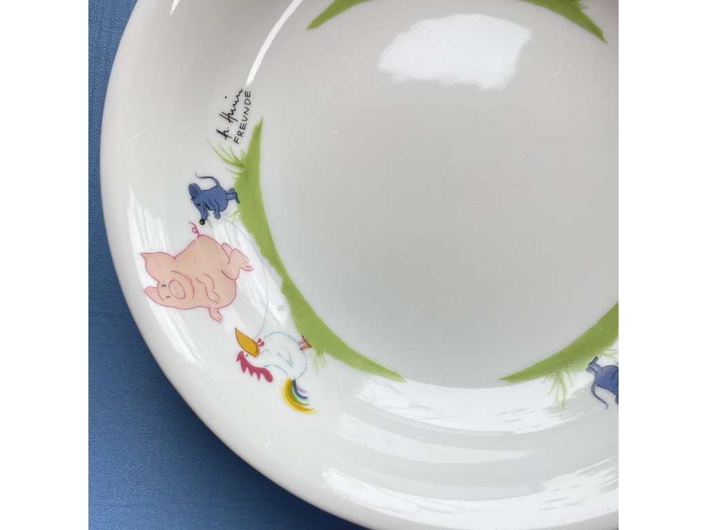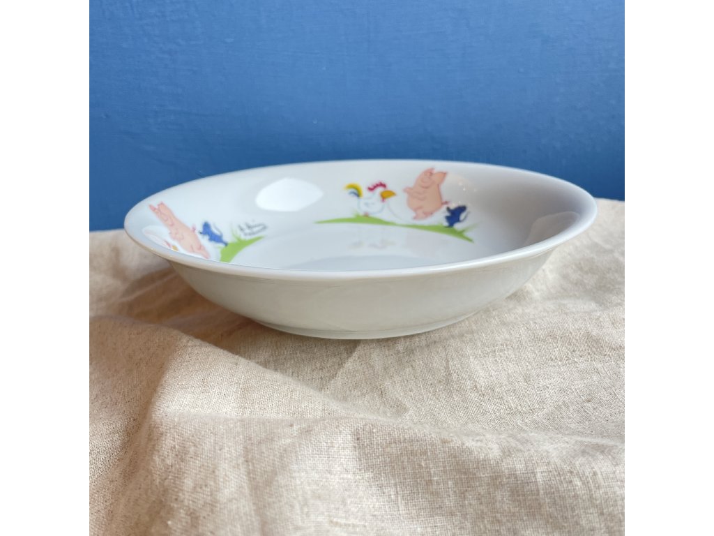 Po obvodu talíře se odvíjí veselá scéna se třemi hlavními postavičkami – růžovým prasátkem, kohoutem s pestrým ocasem a malou modrou myškou.