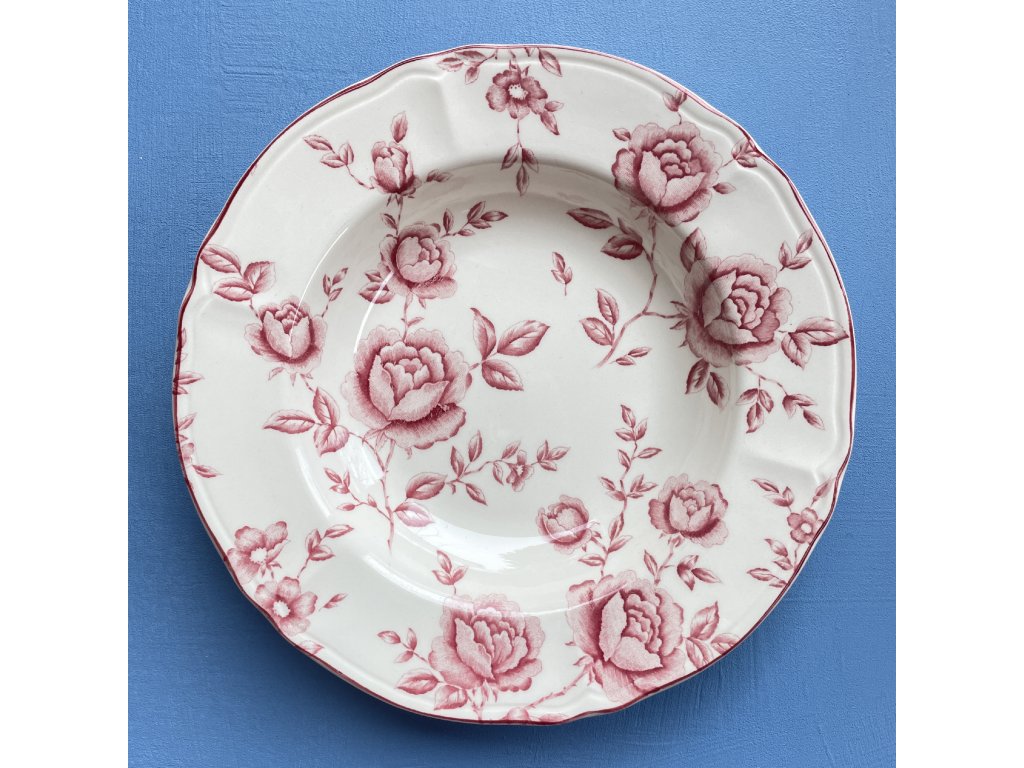 Hluboký talíř je zdoben jemným květinovým dekorem s motivem rozkvetlých růží v odstínech starorůžové až vínové, který je rozprostřen po celé ploše vnitřní části talíře.