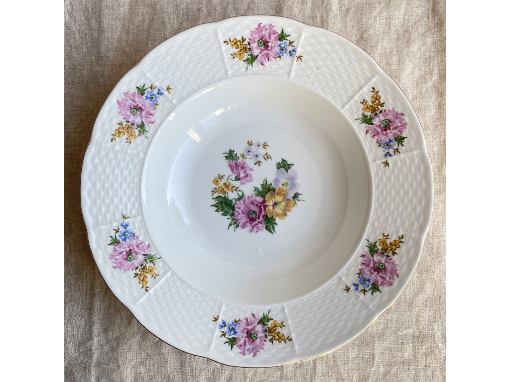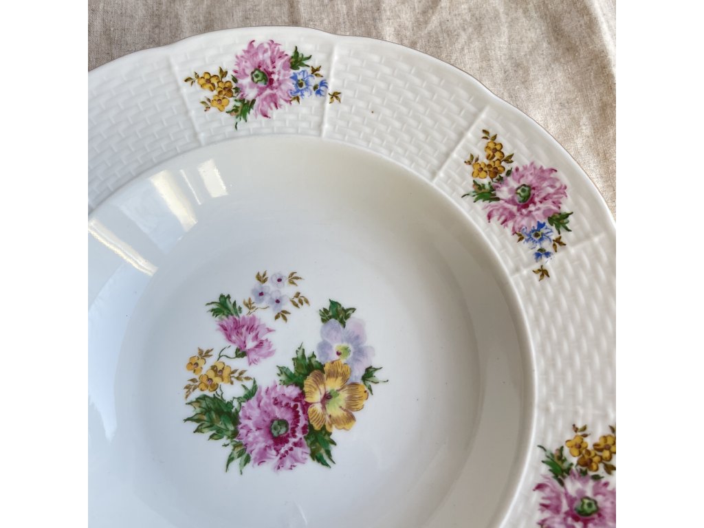 Hluboký talíř je vyroben z bílého porcelánu s lesklou glazurou a zdoben jemným květinovým dekorem.