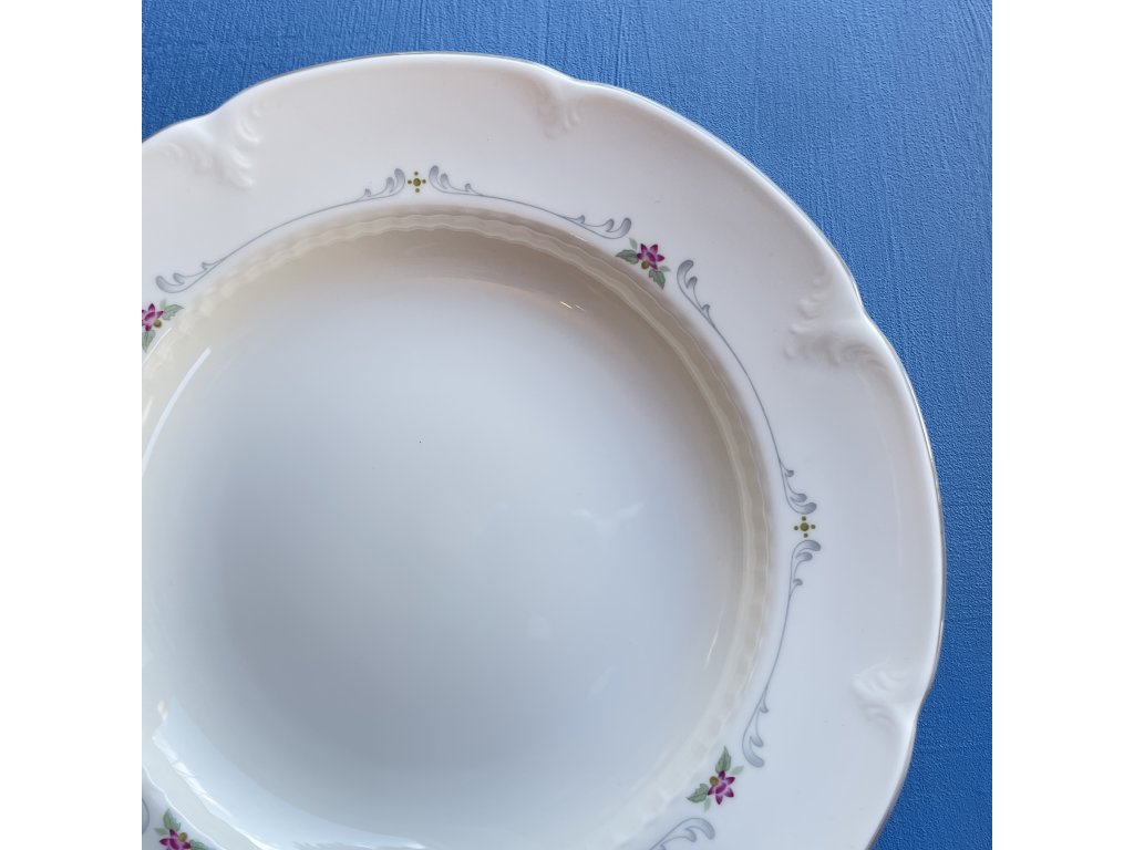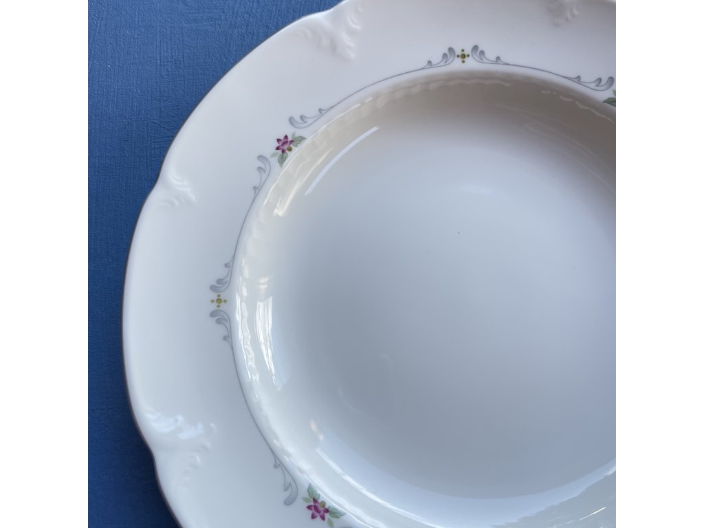 Dekor je velmi střídmý po vnitřním obvodu vede tenká šedá linka doplněná drobnými ornamentálními motivy a jemnými květinovými detaily v růžové barvě se zelenými lístky a nenápadnými zlatavými tečkami.