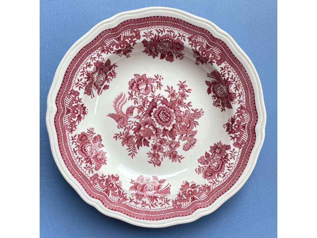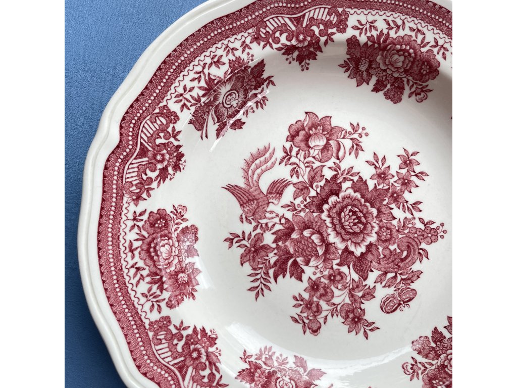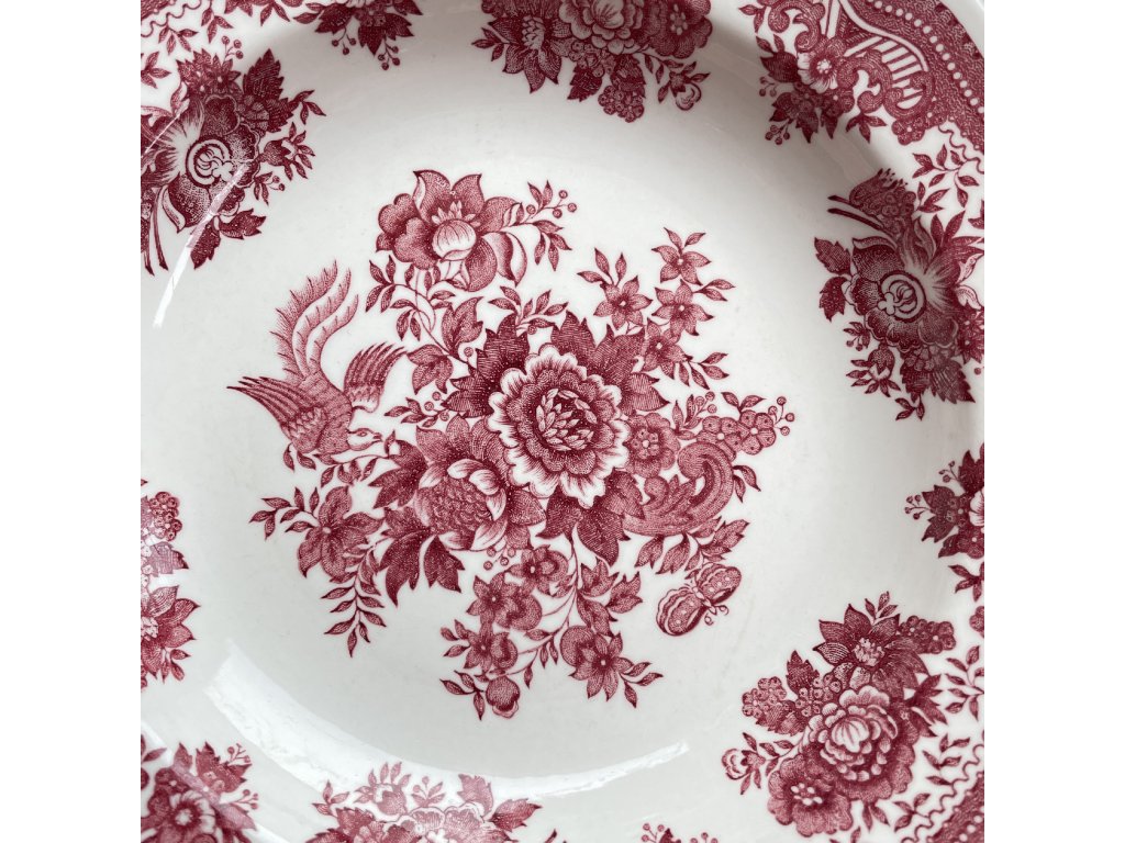 Typický je pro něj bohatý červený transferový dekor s jemně stylizovanými květinovými motivy a ptákem ve středové kompozici, který vychází z tradičních historických vzorů této manufaktury.