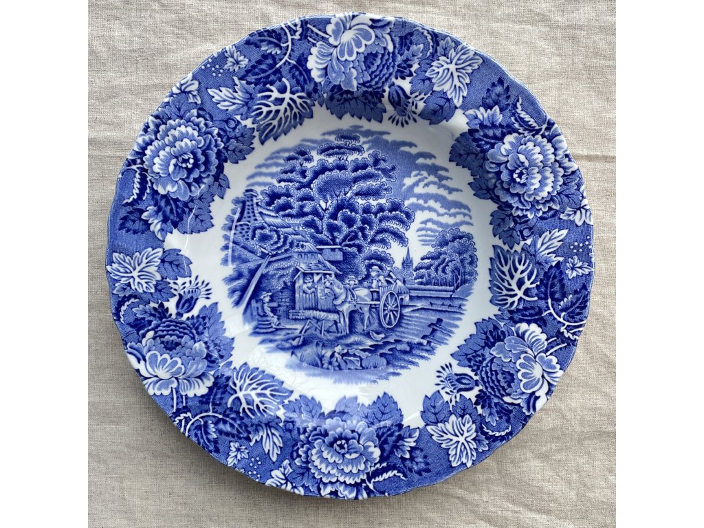 Hluboký talíř je zdoben výrazným modrobílým transferovým dekorem v tradičním anglickém stylu, který kombinuje bohatý květinový okraj s detailně propracovanou centrální venkovskou scénou.
