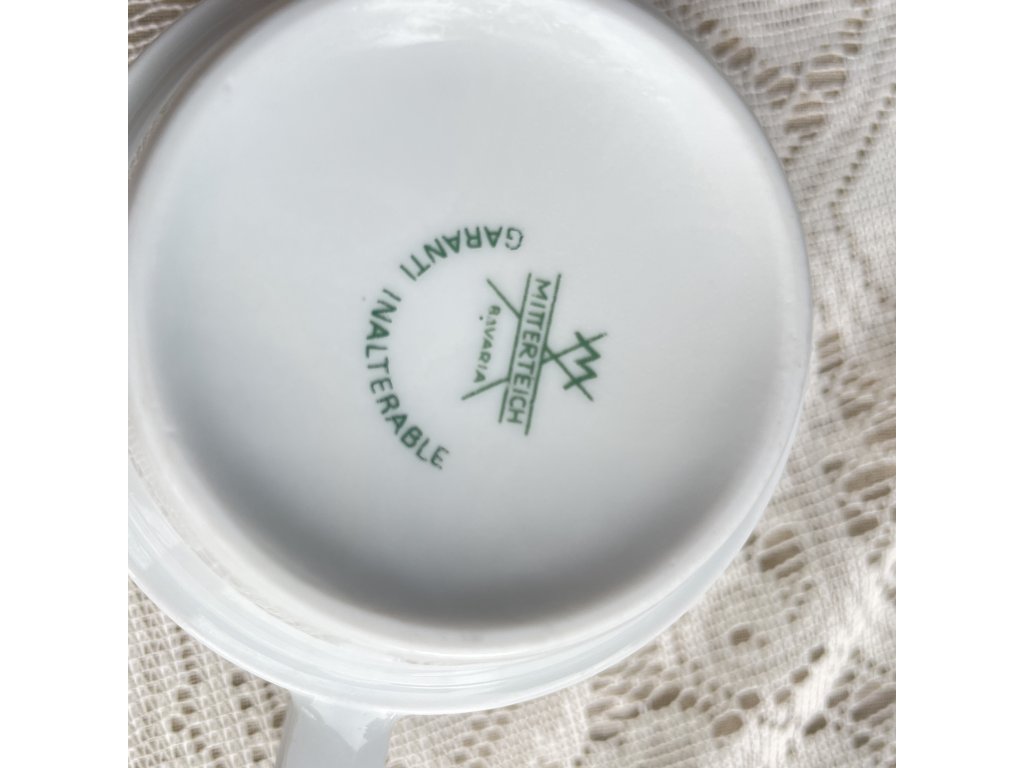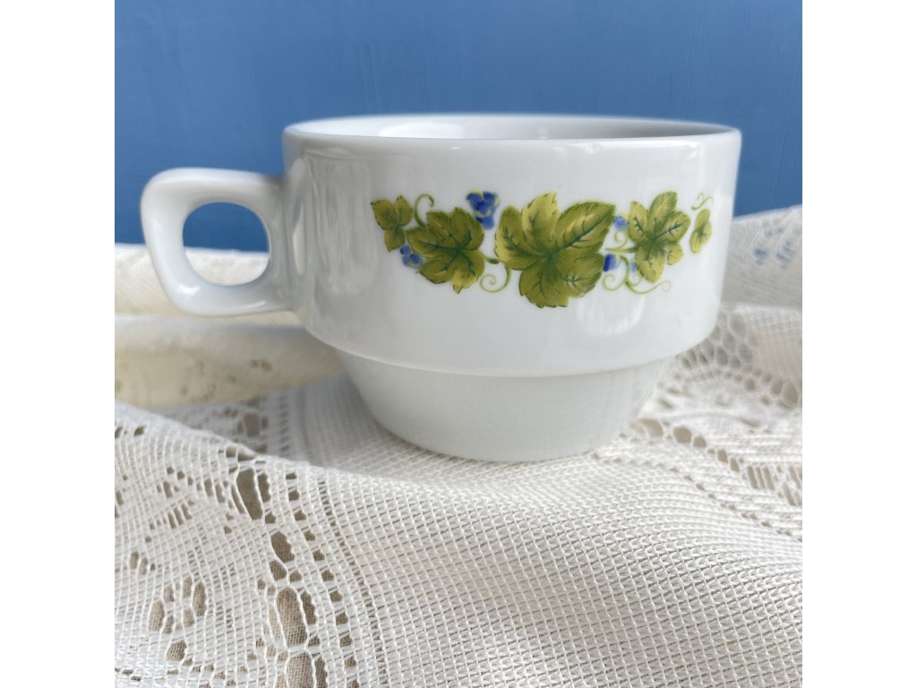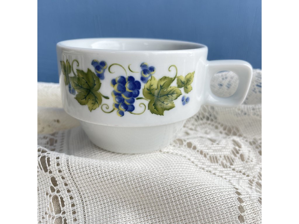 Porcelánový šálek  je vyroben z bílého porcelánu, po obvodu horní části jej zdobí dekor s rostlinným motivem vinné révy, kde se střídají modré hrozny, zelené listy a jemné úponky.
