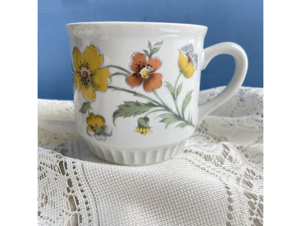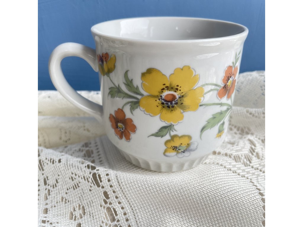 Povrch zdobí květinový dekor s výraznými žlutými a oranžovými květy, doplněnými zelenými listy.