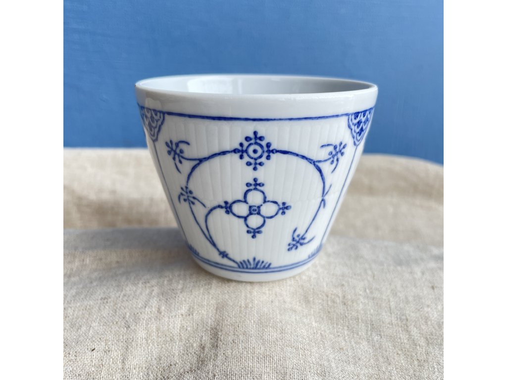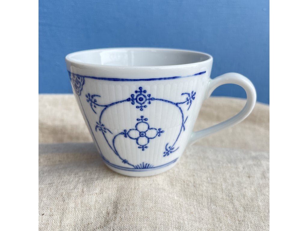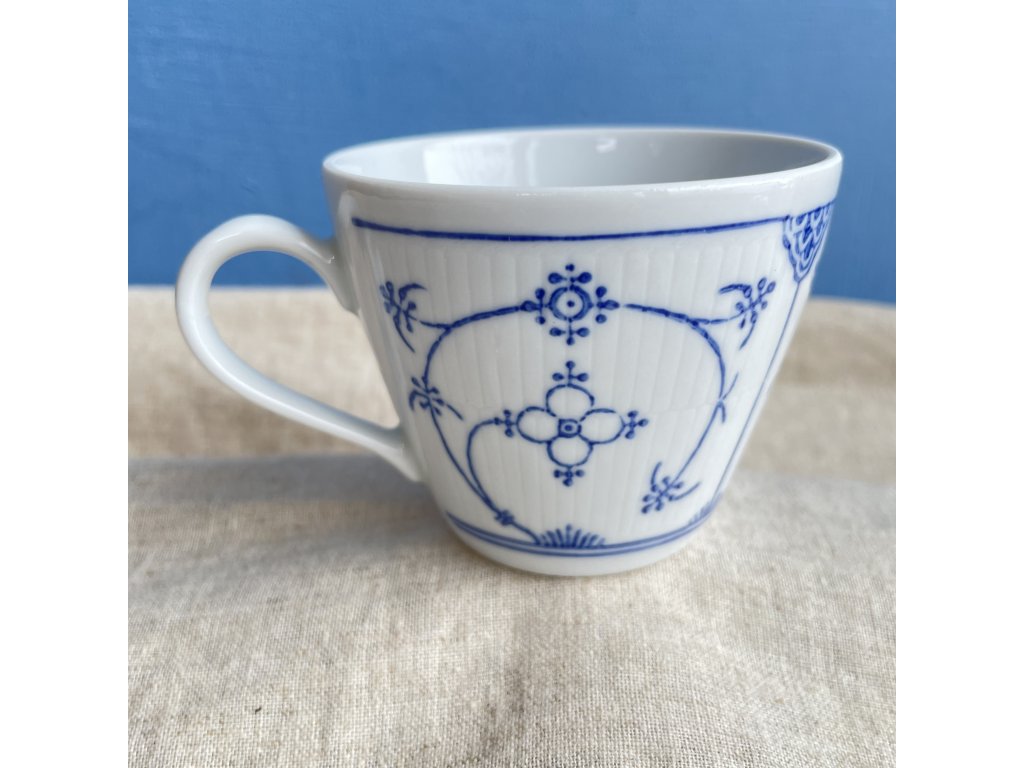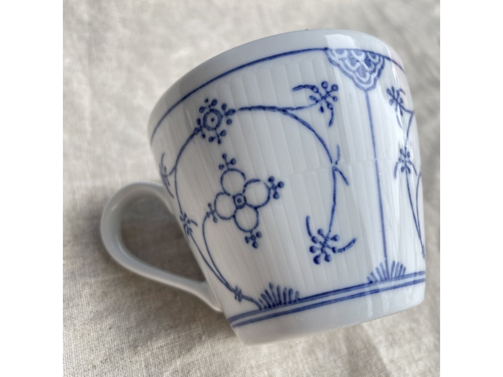 Hrnek má klasický, lehce rozšiřující se tvar s jemně tvarovaným ouškem a zdobí jej reliéfní svislé rýhování po celém obvodu.