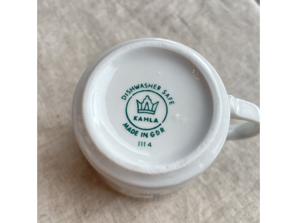 Porcelánový hrnek je vyroben z bílého, kvalitně glazovaného porcelánu a pochází z produkce známé východoněmecké porcelánky Kahla.