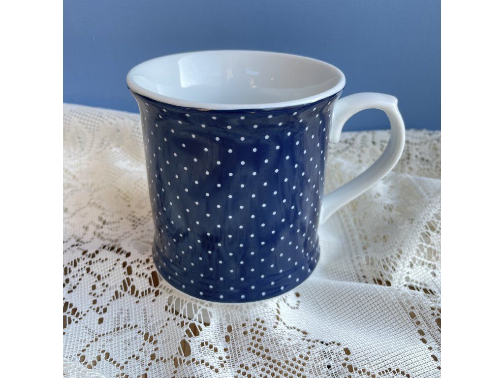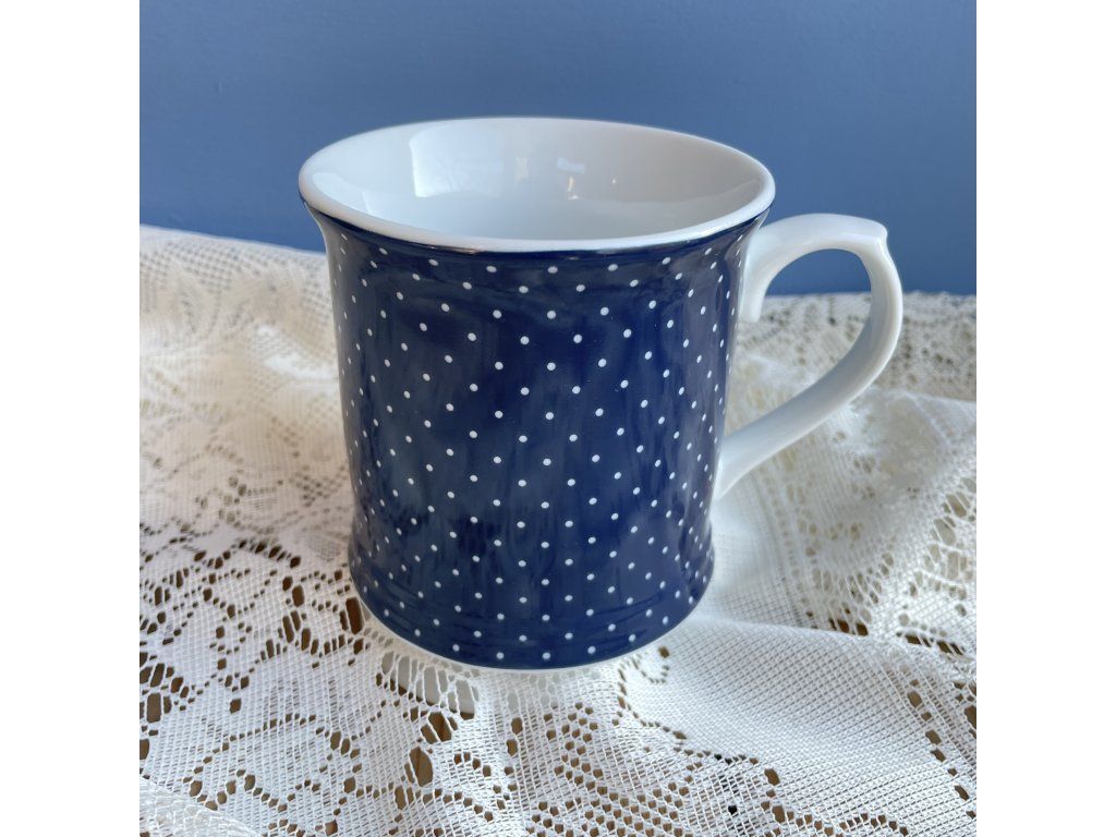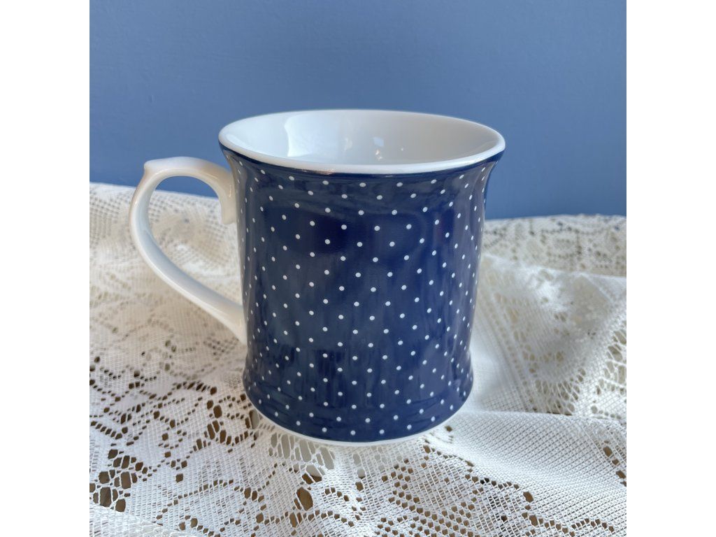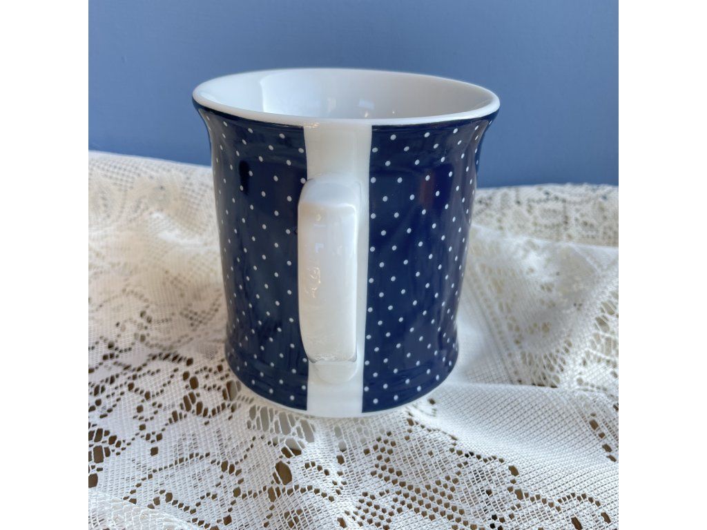 Vnější strana je zdobena tmavě modrou glazurou s drobným bílým puntíkovým dekorem, jenž působí hravě a zároveň nadčasově.