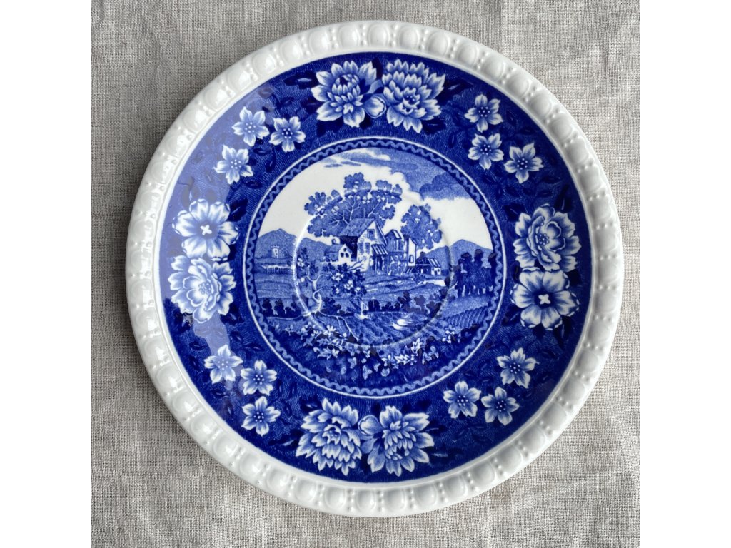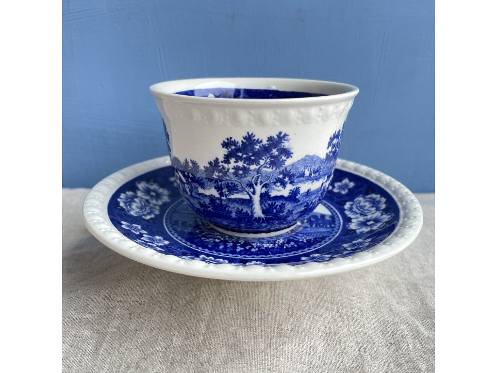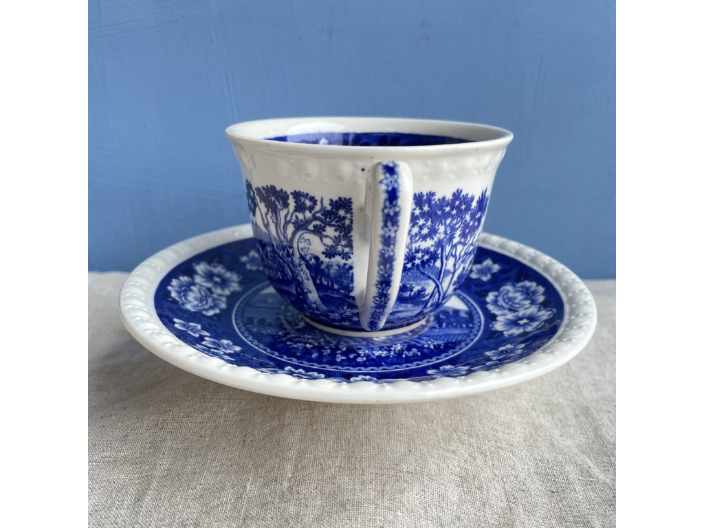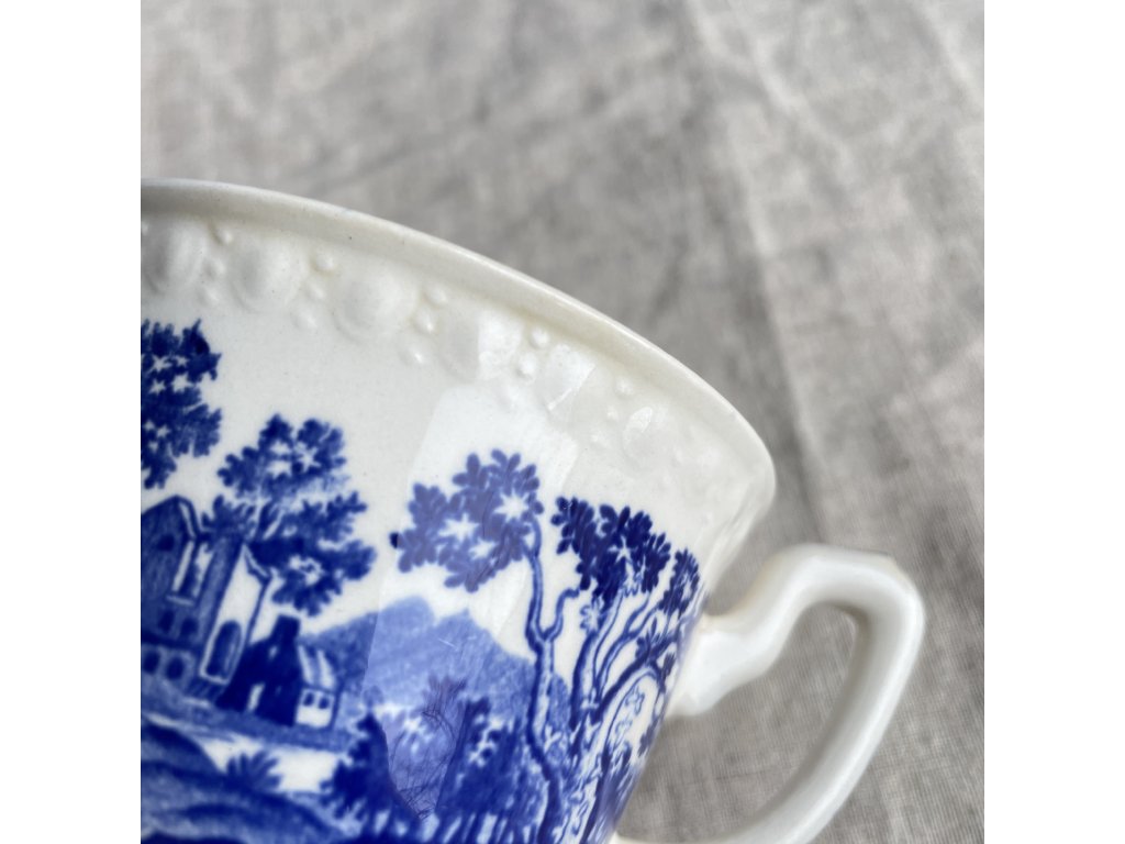 Na vnější straně šálku se rozvíjí jemná venkovská krajina s domy, stromy a vzdálenými kopci, inspirovaná romantickými grafickými předlohami 18. a 19. století, zatímco vnitřní okraj šálku je ozdoben bohatým květinovým lemem v hlubokém kobaltově modrém tónu.