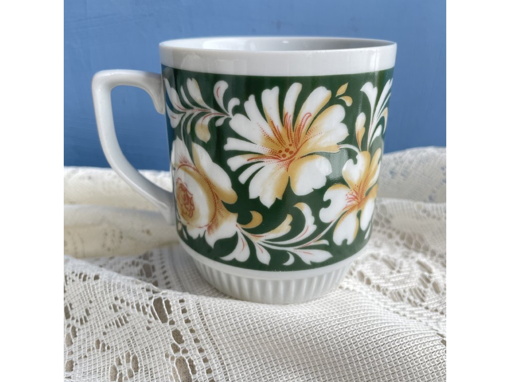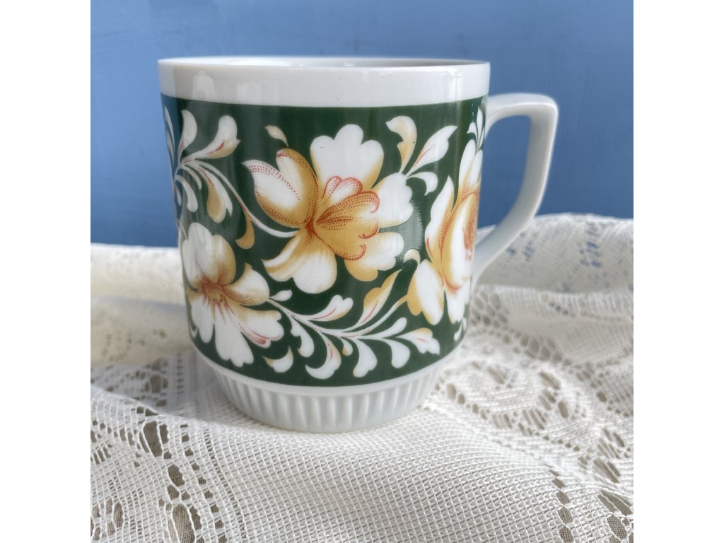 Porcelánový hrnek je vyroben z kvalitního bílého porcelánu a zaujme výrazným dekorativním pásem v sytě zelené barvě, který obepíná celé tělo hrnku.