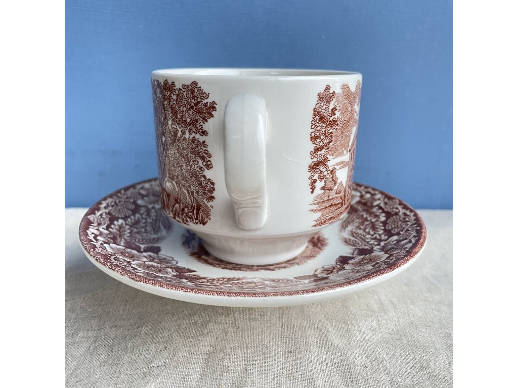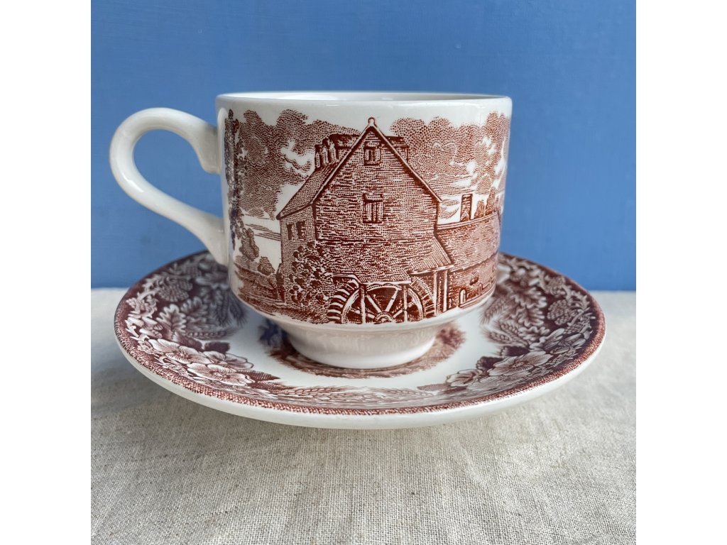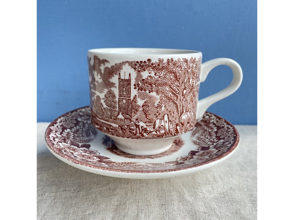 Hrnek má klasický tvar s jemně klenutým uchem a je zdoben hnědočerveným transferovým tiskem s venkovskou krajinou, v níž se objevují historické stavby, stromy a klidné přírodní scenérie.