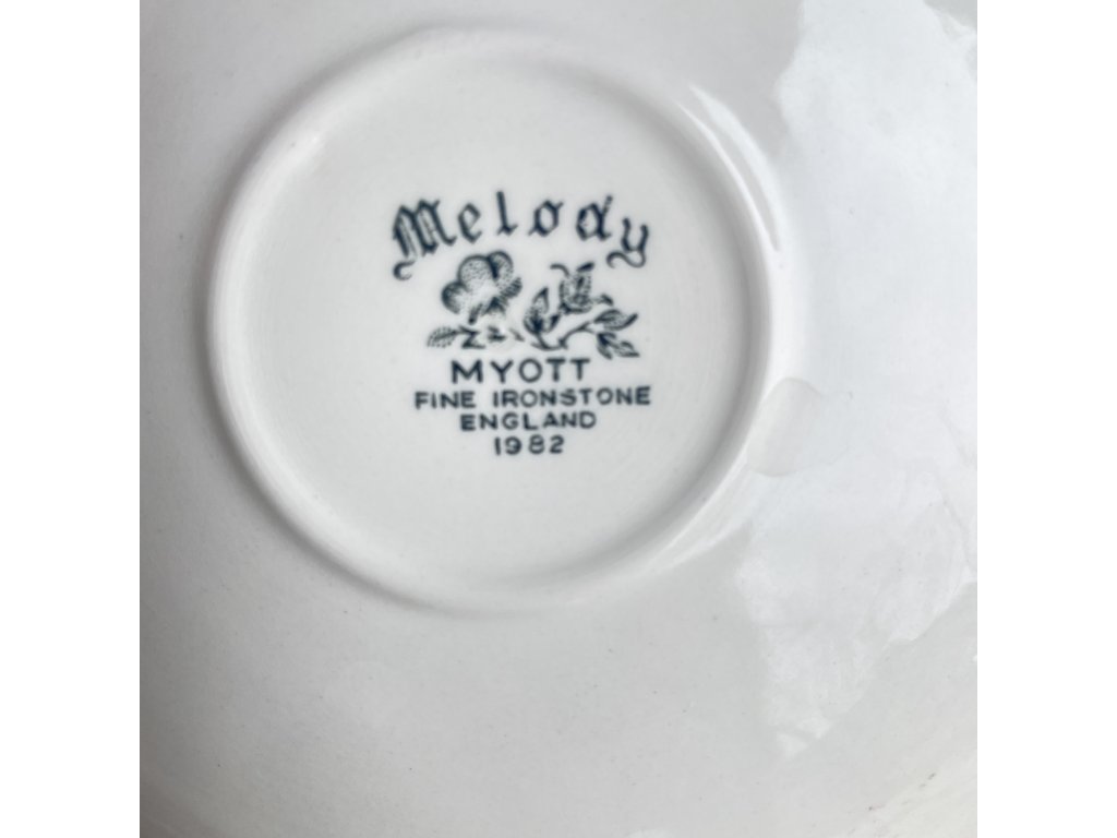 Na spodní straně je souprava značena Myott s označením Fine Ironstone England a názvem dekoru Melody, datovaným do roku 1982.