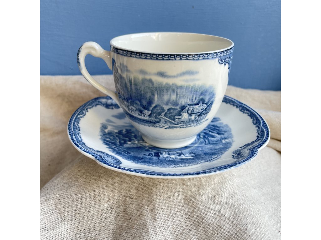 Šálek s podšálkem z anglické kameniny je součástí slavné série Old Britain Castles, kterou vyráběla značka Johnson Bros, jedna z nejuznávanějších anglických porcelánek.