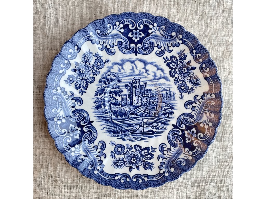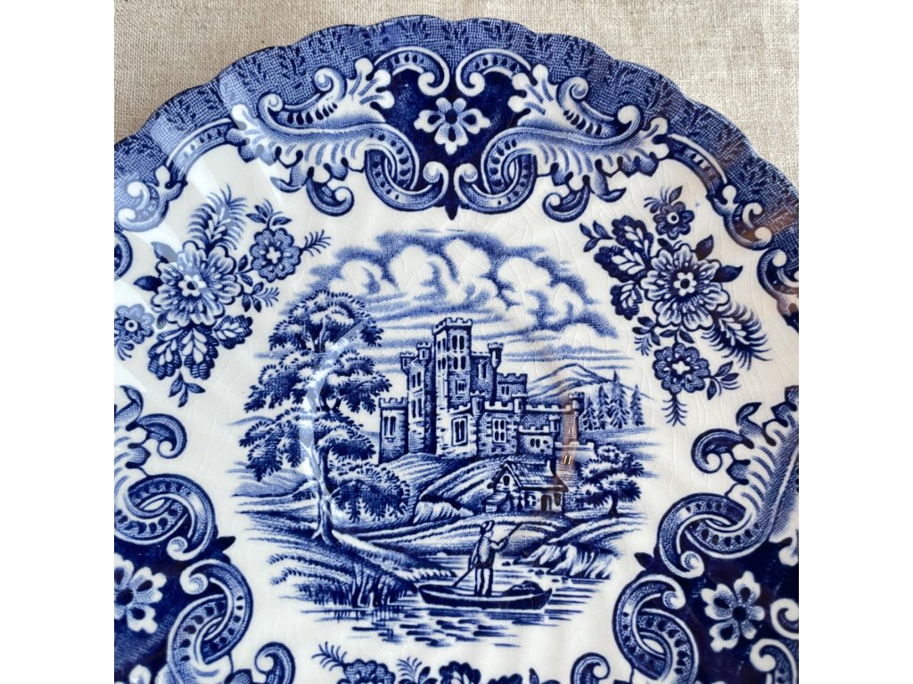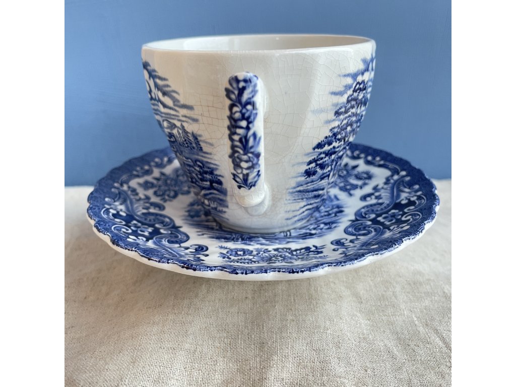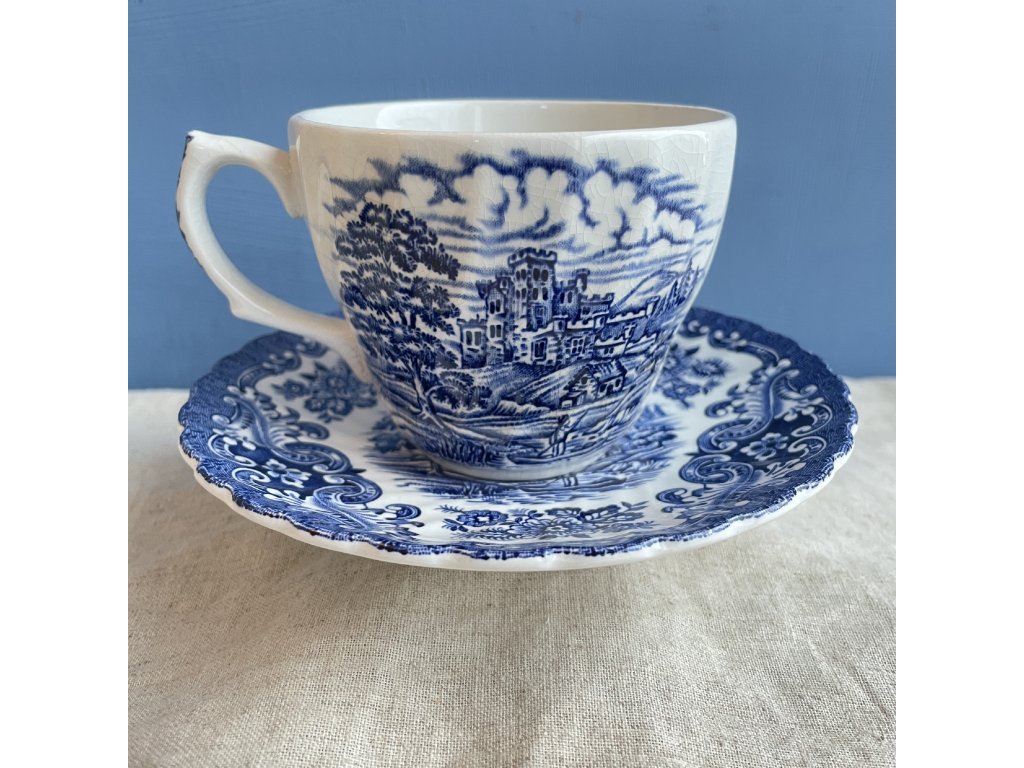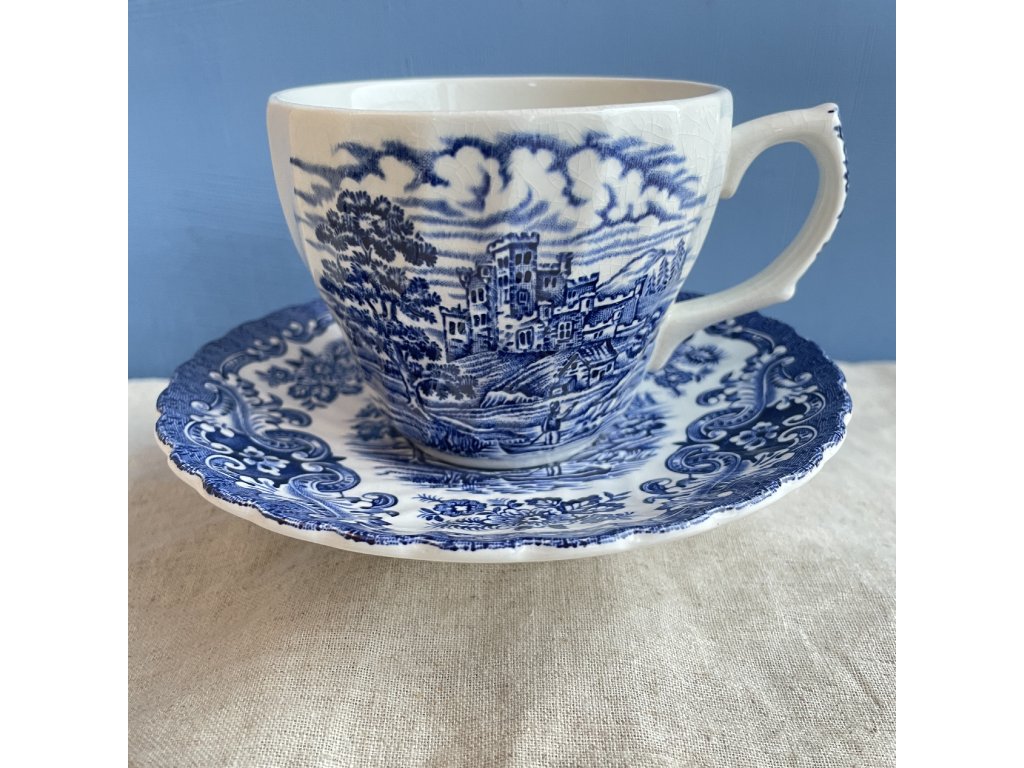 Hrnek s podšálkem je vyroben z kvalitního anglického ironstone a nese tradiční modrobílý transferový dekor ze série Olde Country Castles, inspirované romantickými pohledy na historické hrady a venkovskou krajinu.