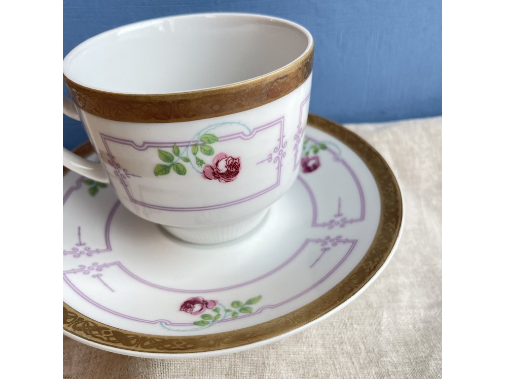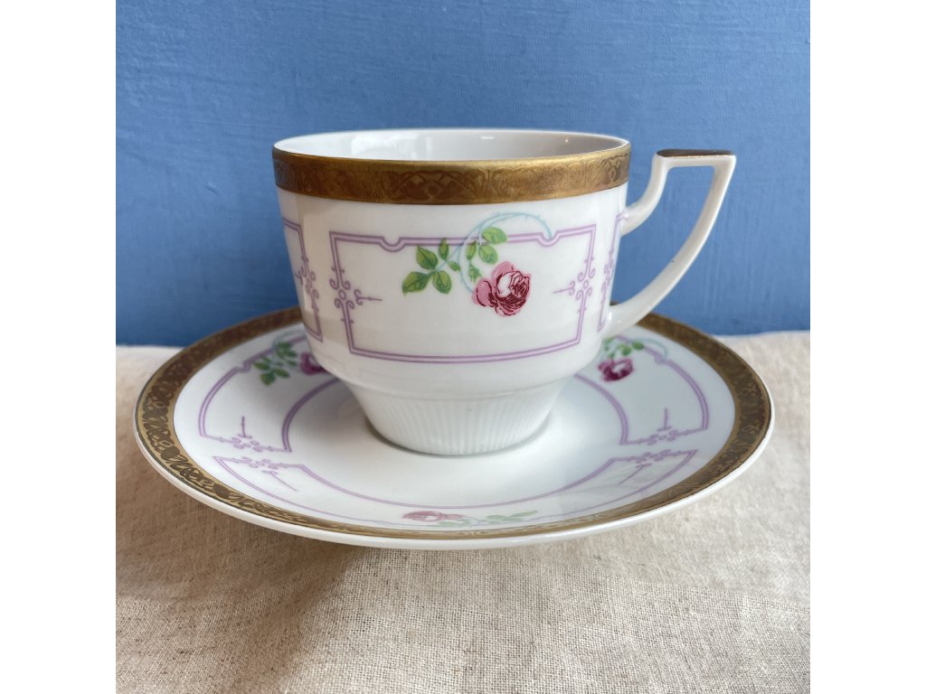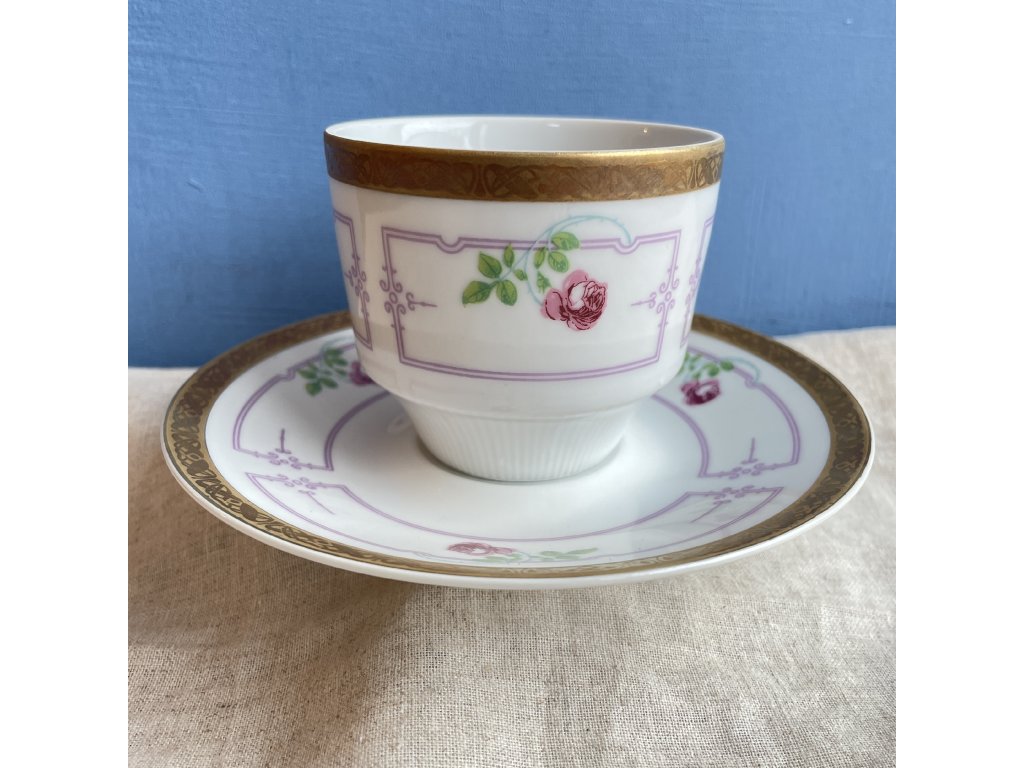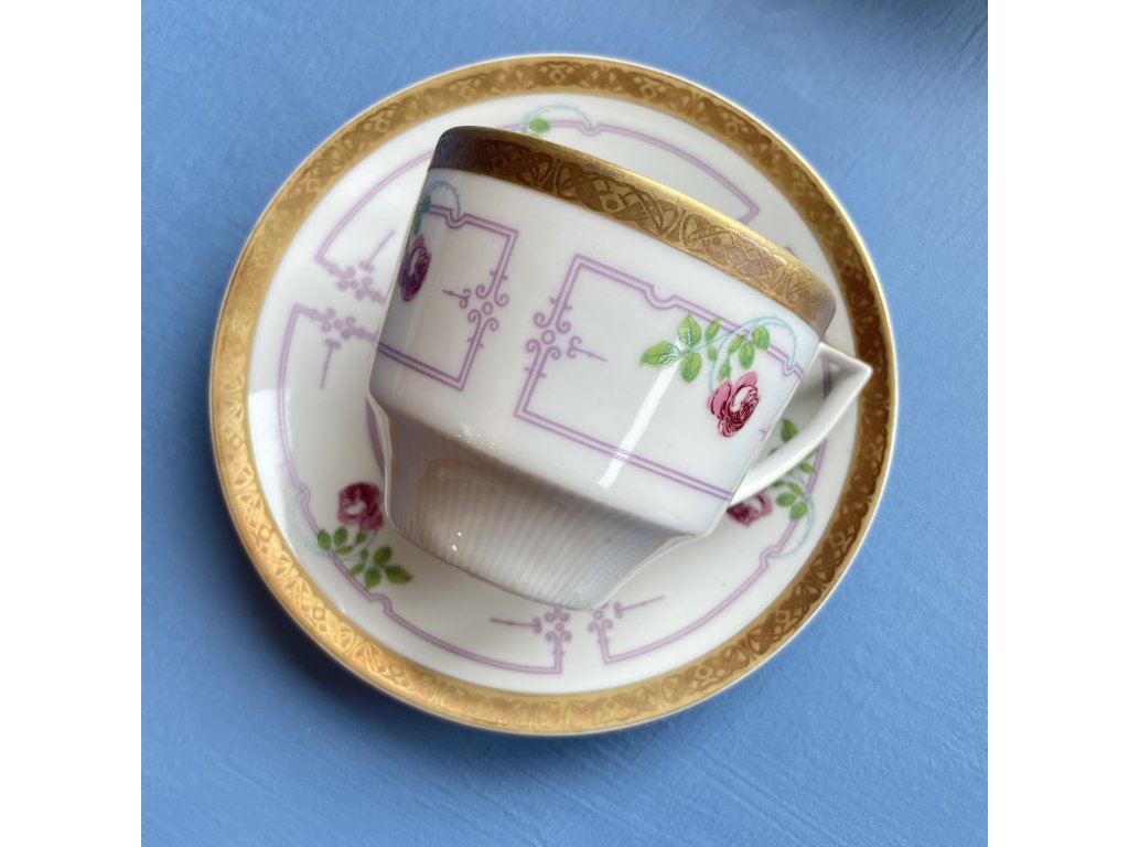 Střední část podšálku i hrneček jsou dekorovány subtilními růžovými linkami tvořícími geometrizující rámování, doplněné drobnými květinovými motivy růží v růžových odstínech se svěže zelenými lístky.