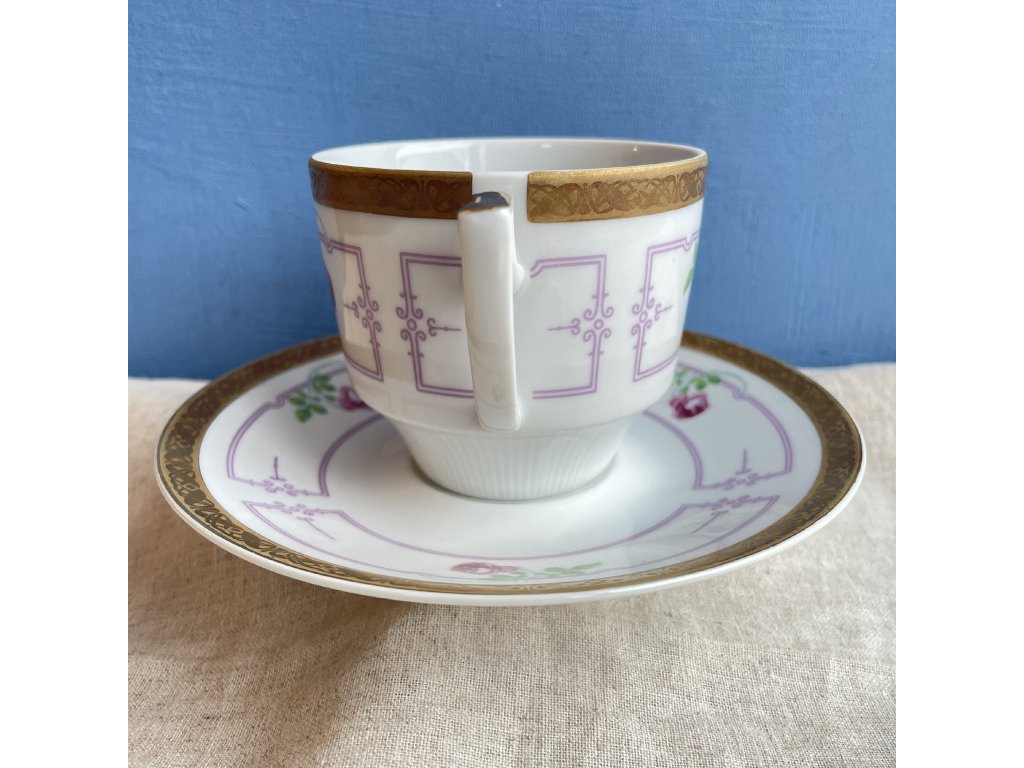 Krásný hrnek s podšálkem vyroben z jemného porcelánu.