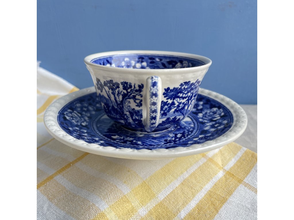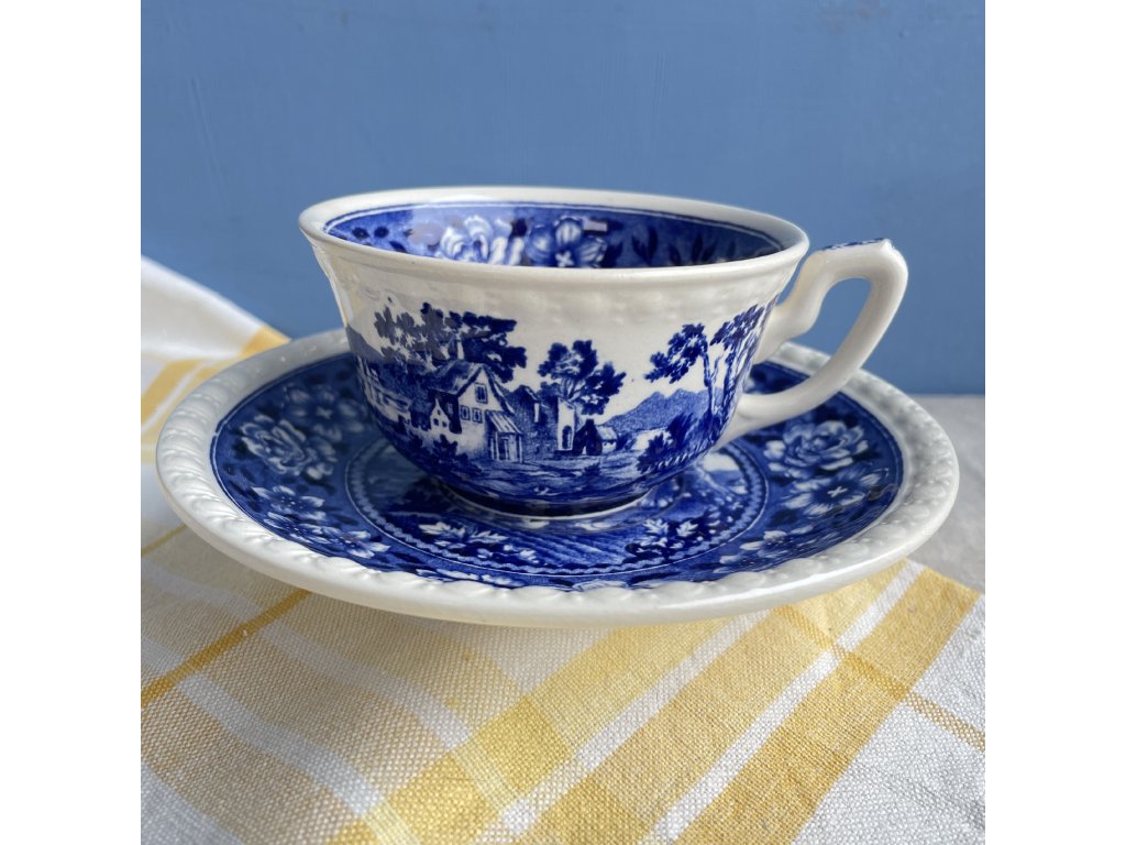 Na vnější straně šálku se rozvíjí jemná venkovská krajina s domy, stromy a vzdálenými kopci, inspirovaná romantickými grafickými předlohami 18. a 19. století, zatímco vnitřní okraj šálku je ozdoben bohatým květinovým lemem v hlubokém kobaltově modrém tónu.