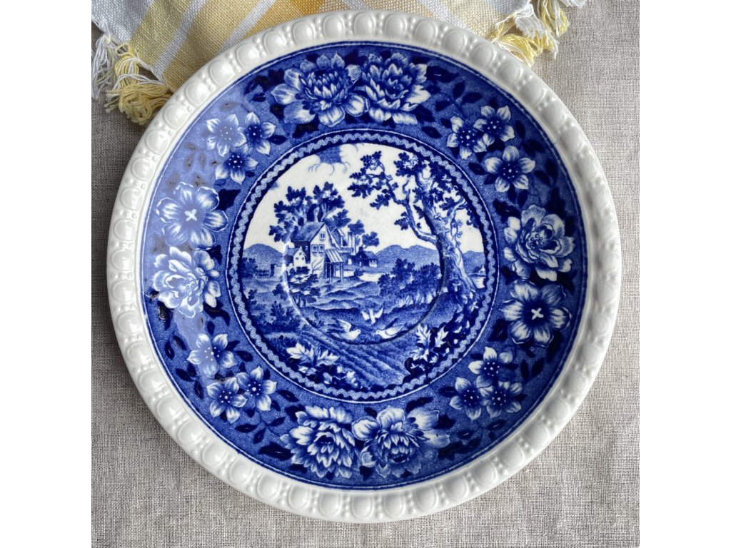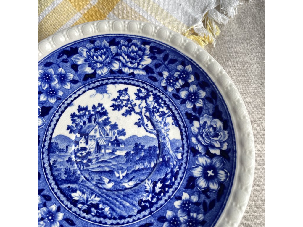 Podšálek je laděn do stejného dekoru, s centrálním krajinovým motivem obklopeným výrazným florálním rámem a plastickým okrajem, který celek vizuálně sjednocuje a dodává mu klasický, lehce rustikální charakter.