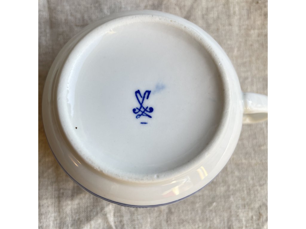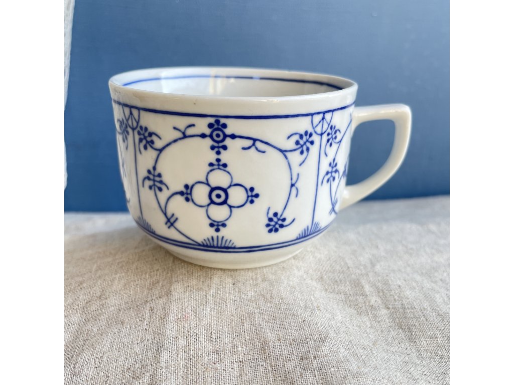 Porcelánový hrnek má jednoduchý a přitom elegantní vzhled díky bílé glazuře s jemným, kobaltově modrým dekorem.