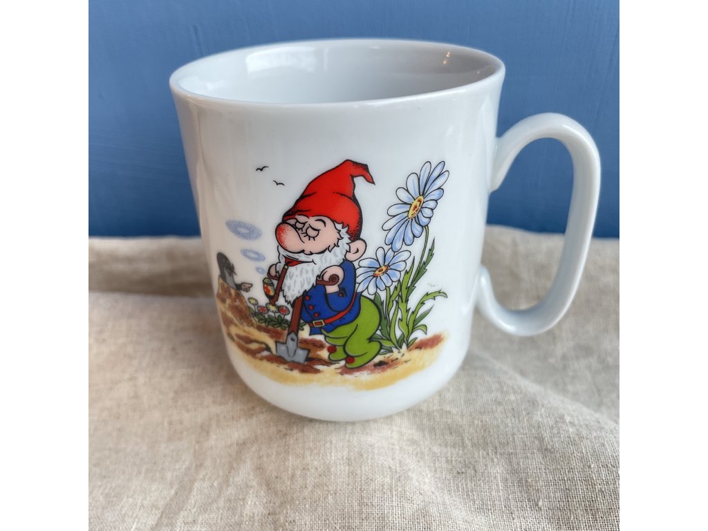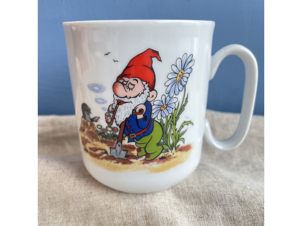 Hlavním motivem je trpaslík s červenou čepicí na zahrádce.