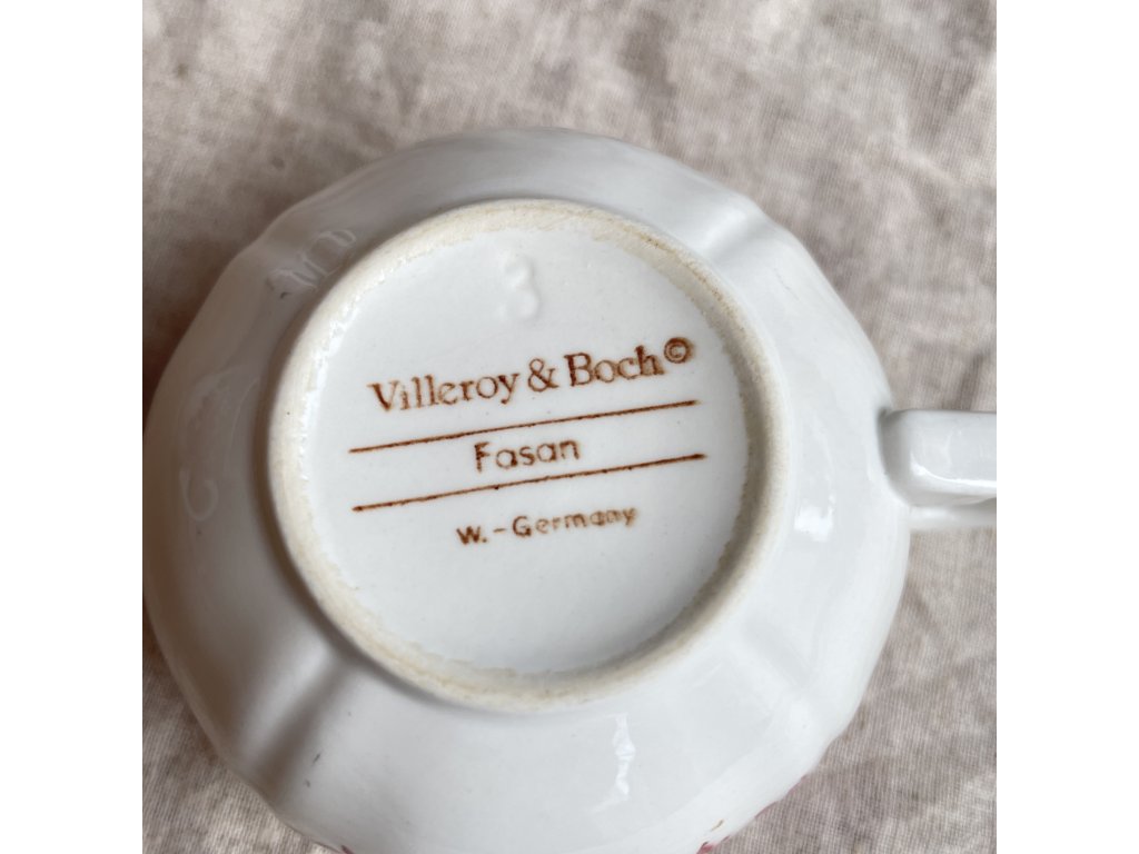 Na spodní straně se nachází značka Villeroy & Boch s označením Fasan a původu W.-Germany, což potvrzuje výrobu v západním Německu a řadí hrnek do druhé poloviny 20. století.