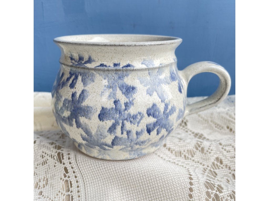 Povrch je opatřen světle krémovou glazurou s typickým modrým „cákancovým“ dekorem, který vzniká ručním nanášením a dává každému kusu mírně odlišný, originální vzhled. Připomíná sněhové vločky.