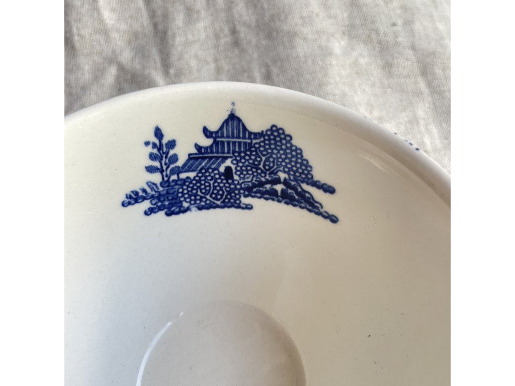 Na hrnku se rozvíjí známá krajinná scéna – pagoda, most, loďka a dvojice ptáků v letu – provedená v sytě kobaltové modři na bílém podkladu.
