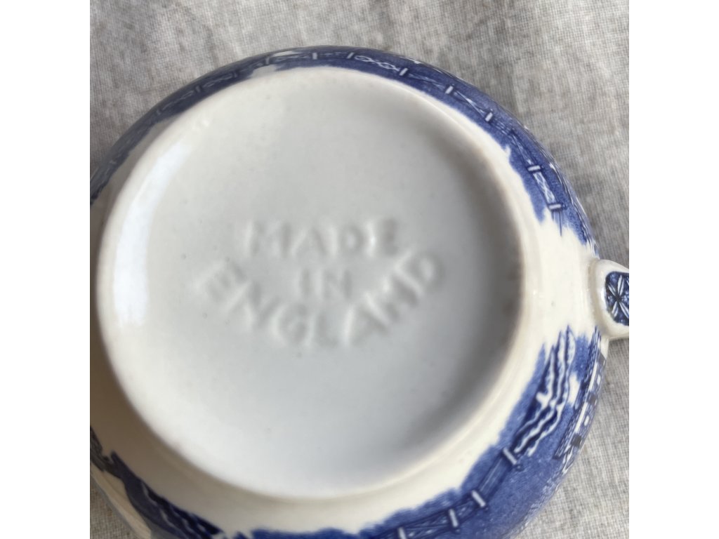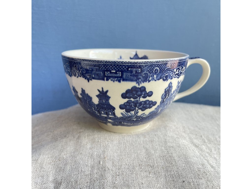 Hrnek v klasickém tvaru s jemně rozšířeným okrajem a uchem s plastickým detailem nese tradiční modrobílý dekor Willow Pattern, oblíbený symbol anglické keramické tradice již od konce 18. století.