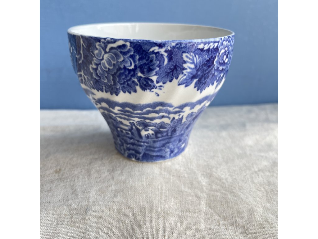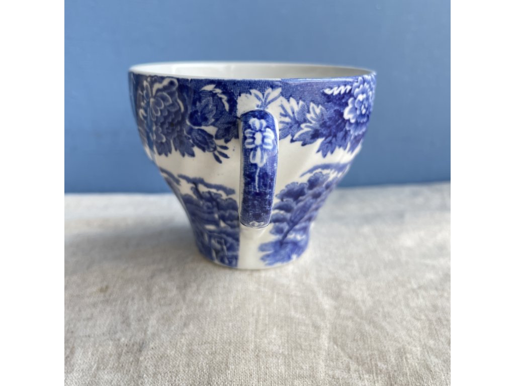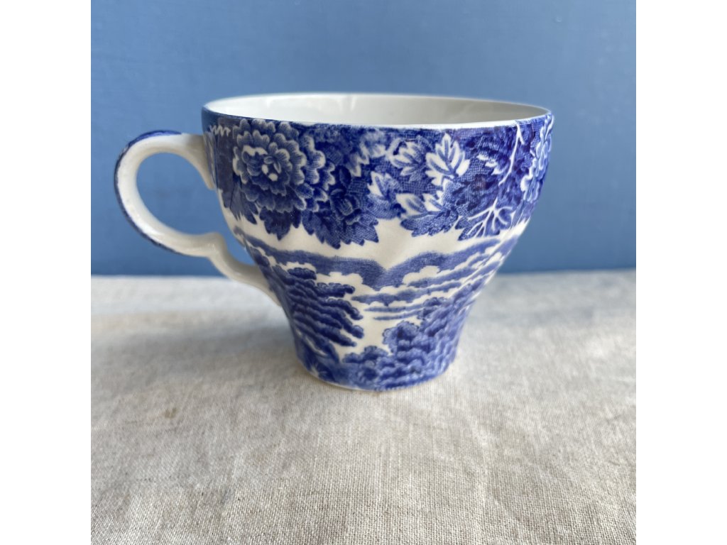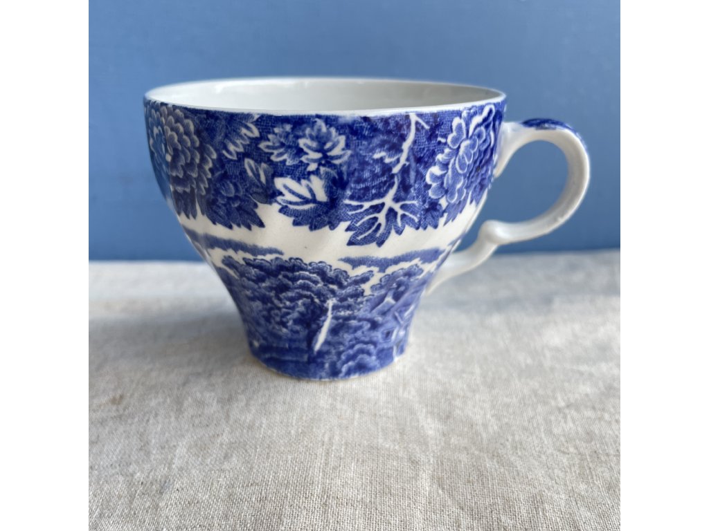 Hrnek z anglického porcelánu je proveden v klasickém modrobílém transferovém dekoru English Scenery, který kombinuje bohatý květinový pás v horní části s jemně kreslenou krajinnou scénou v dolní části. Motiv zobrazuje stromy, oblaka a vzdálenou krajinu v typickém romantickém pojetí anglické keramiky inspirované 19. stoletím.