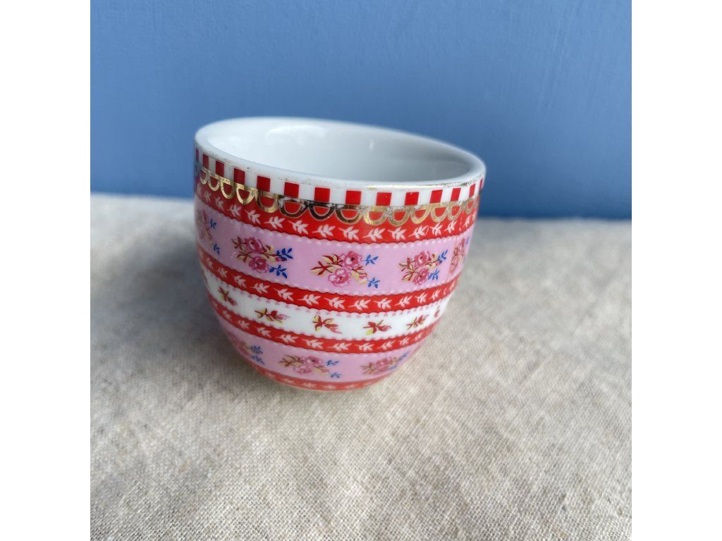 Kalíšek je bohatě dekorován pruhy v odstínech červené, růžové a bílé, mezi nimiž se objevují drobné květinové motivy v pastelových barvách – především růžové kvítky doplněné modrými a zelenými detaily.
