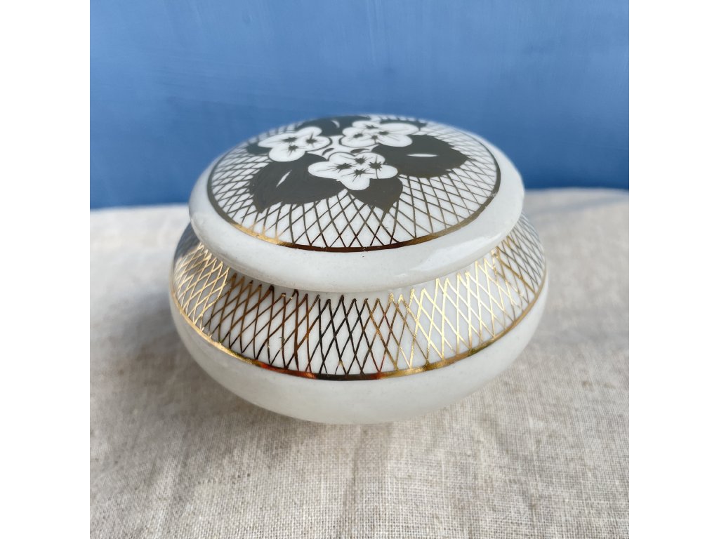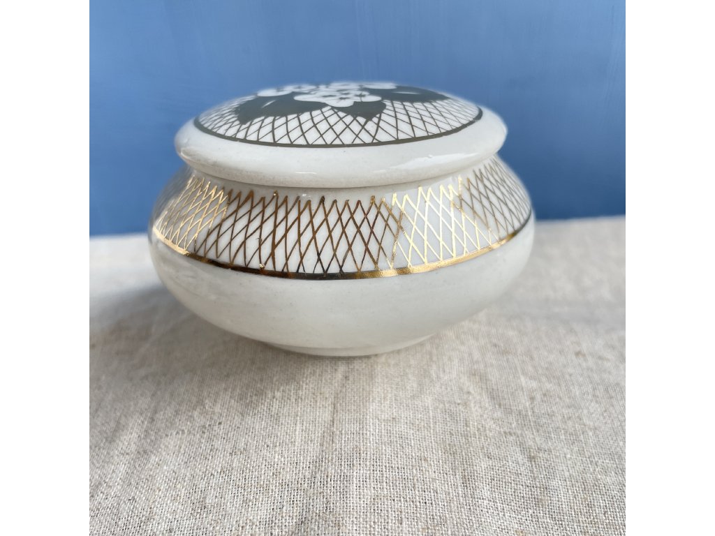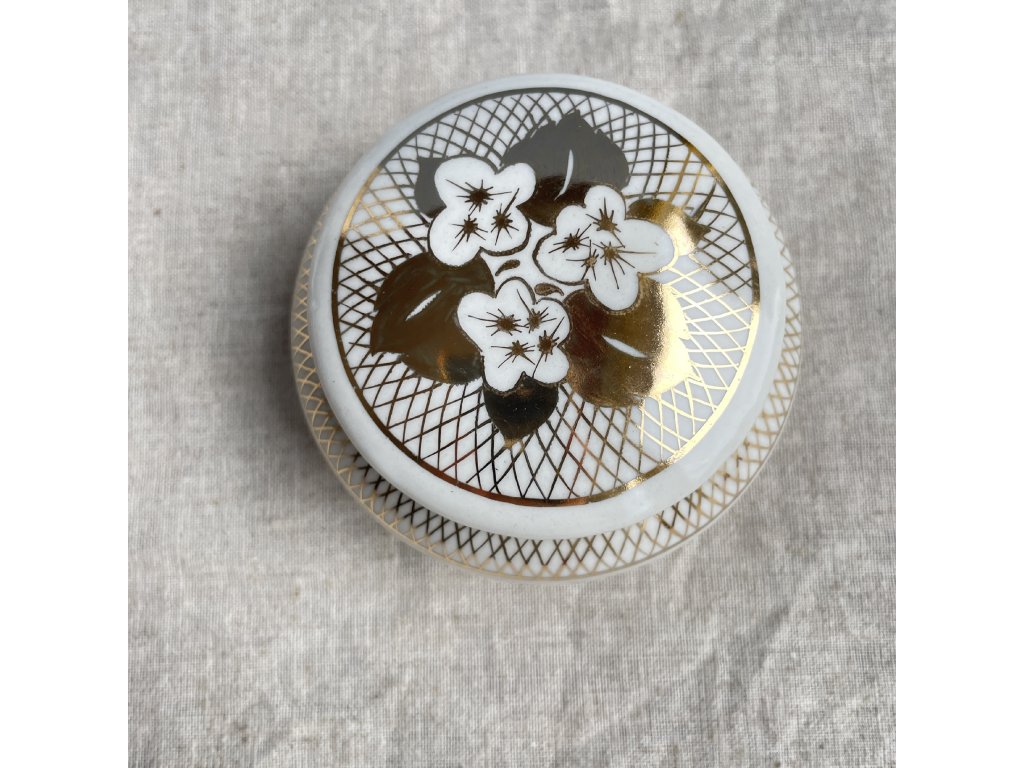 Uprostřed víčka se nachází malovaný květinový motiv – bílé květy s výrazným zlacením.