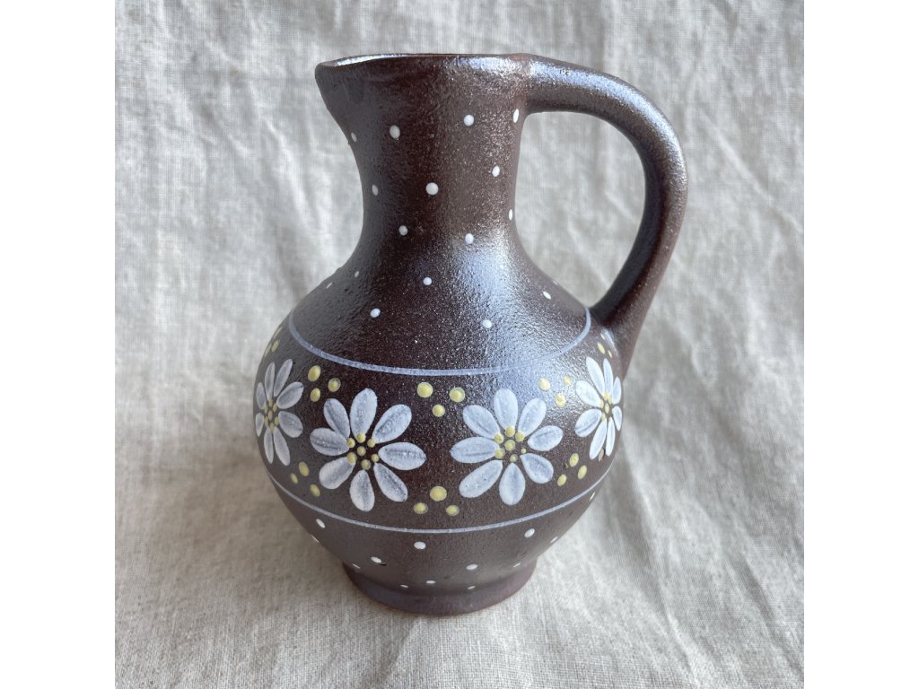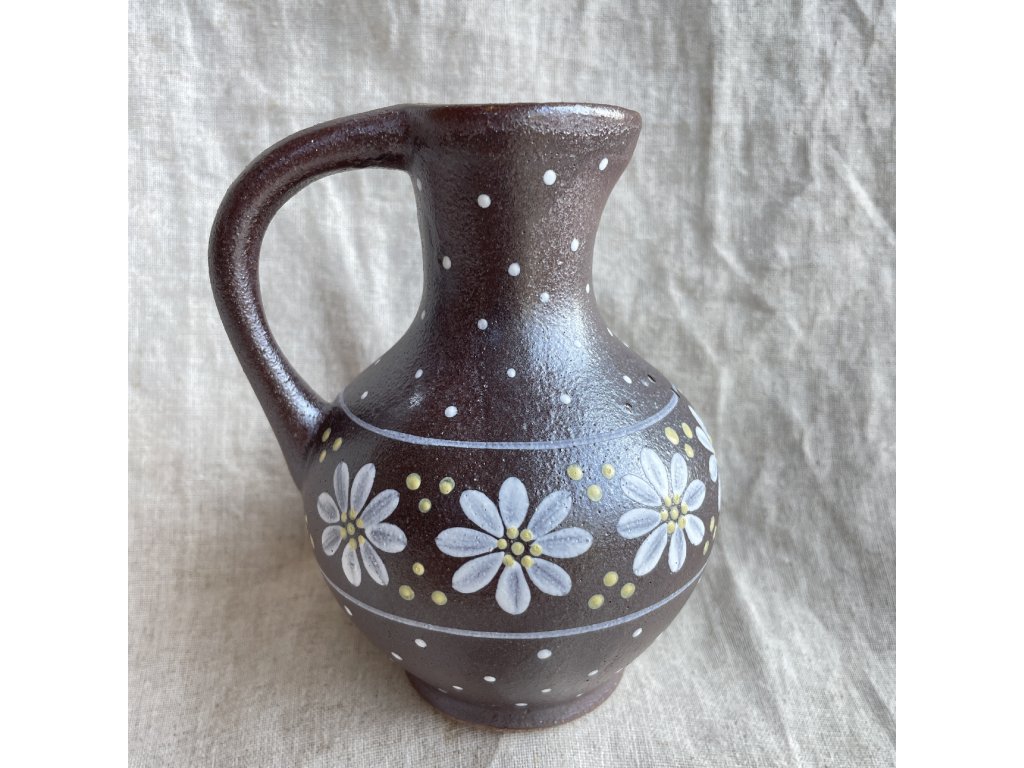 Dominantním prvkem je ručně malovaný dekor: kolem nejširší části těla se vine pás bílých květů se žlutými středy, doplněný drobnými puntíky.