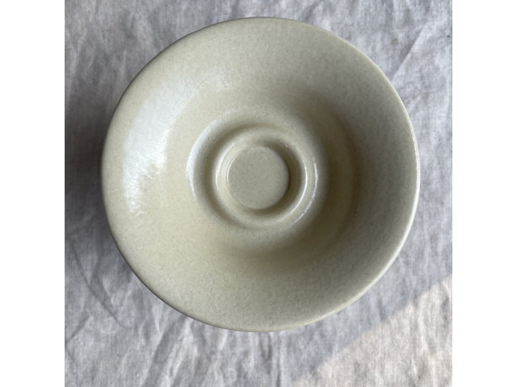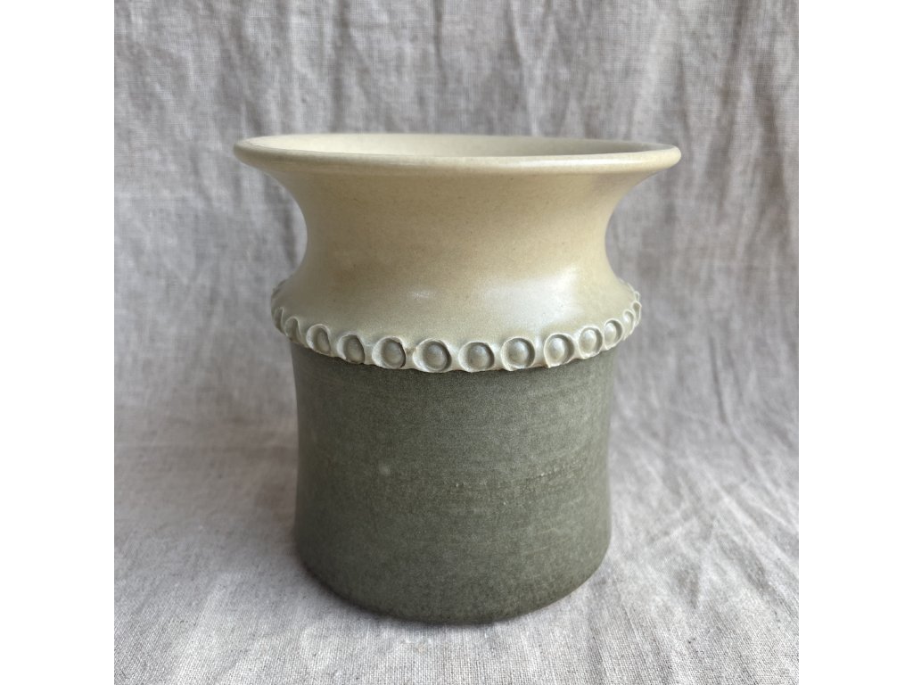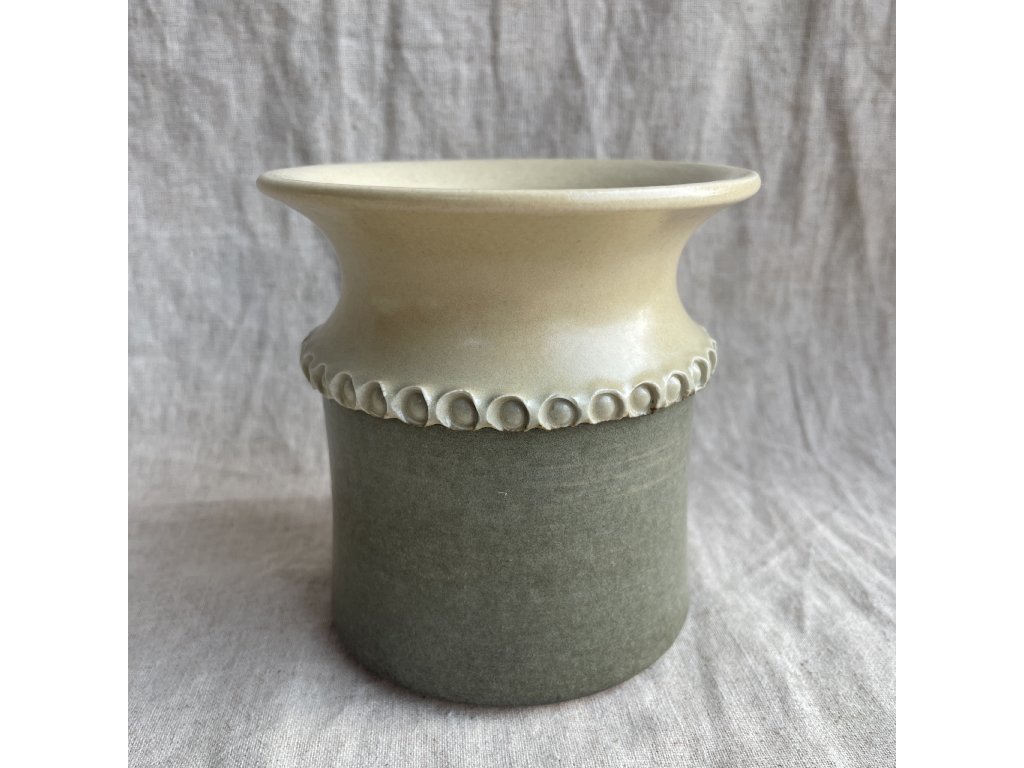 Má válcovitou spodní část v tlumeném zelenošedém odstínu, která plynule přechází do světle krémového horního okraje.