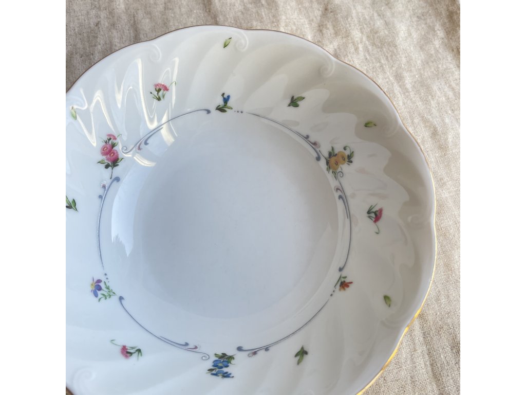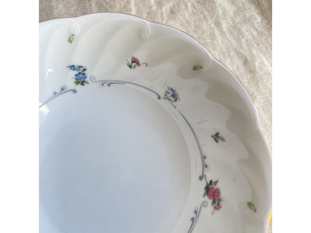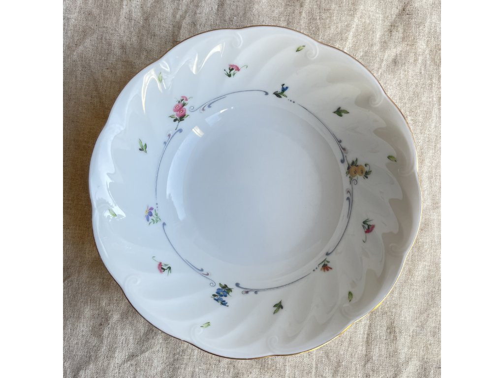 Miska má klasický kulatý tvar s mírně rozšířeným, plasticky tvarovaným okrajem, který vytváří jemně vlnitý reliéf.