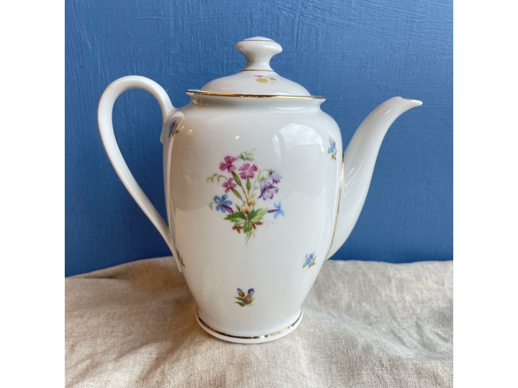 Okraj konvice, víčka, výlevka i patka jsou zvýrazněny jemnou zlatou linkou.