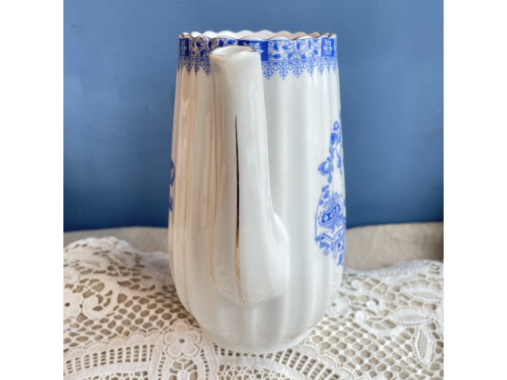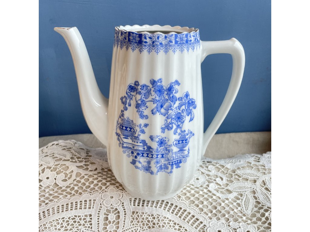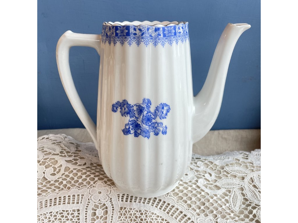 Porcelánová konvice je elegantním příkladem středoevropské produkce v modrobílém dekoru, který čerpá z tradice jemných květinových ornamentů.