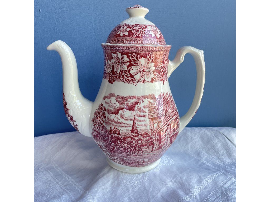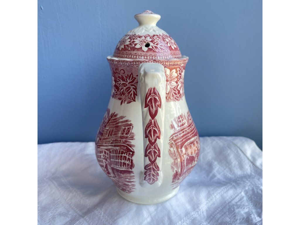 Kameninová konvice představuje typický příklad anglické produkce s červeným transferovým dekorem ze série „Coaching Taverns“.