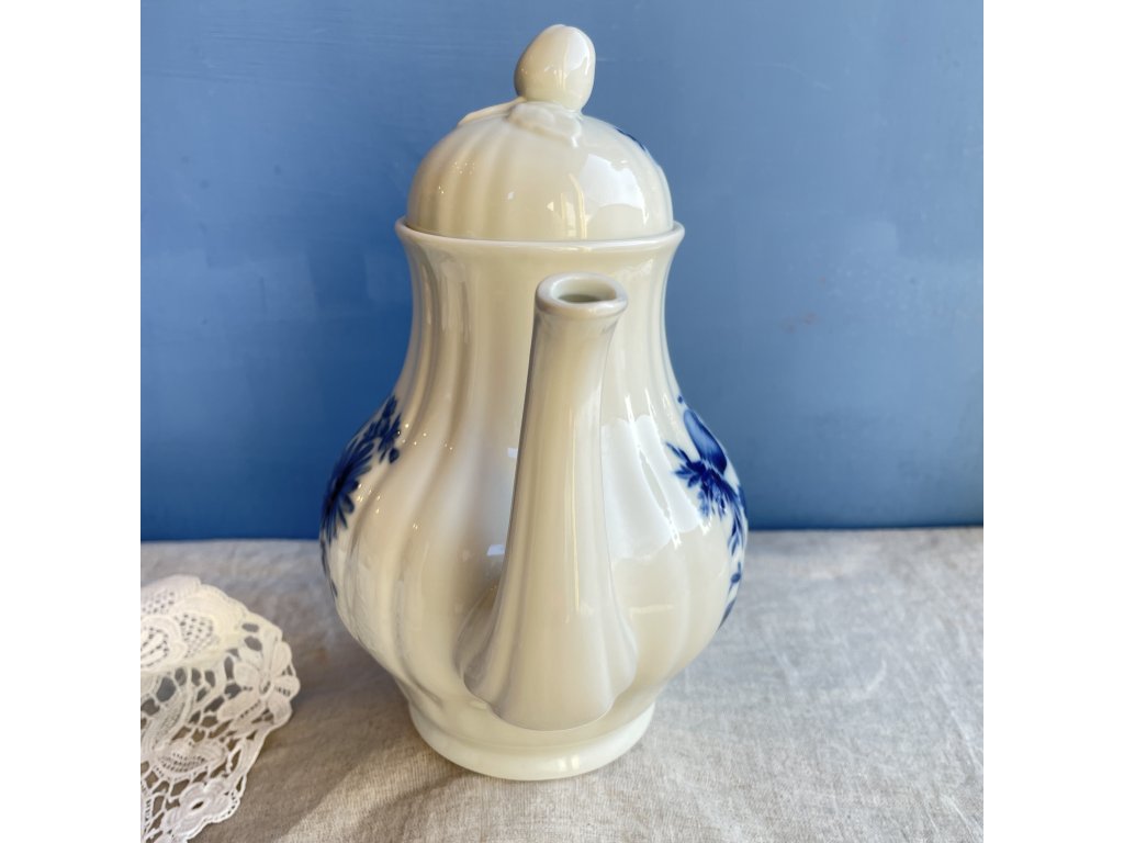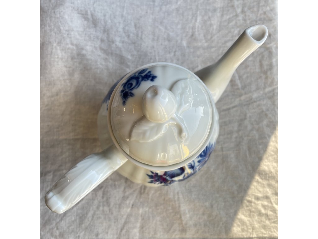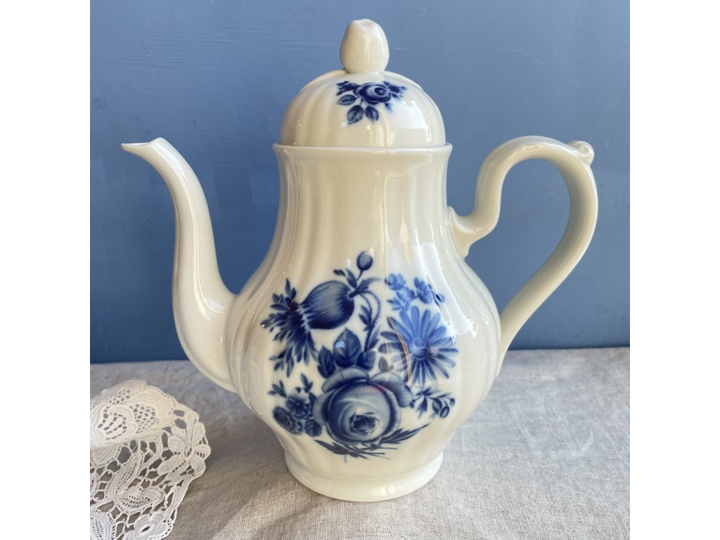 Přední stranu konvice zdobí podglazurní kobaltově modrý dekor s bohatým květinovým motivem růží a lučních květů.