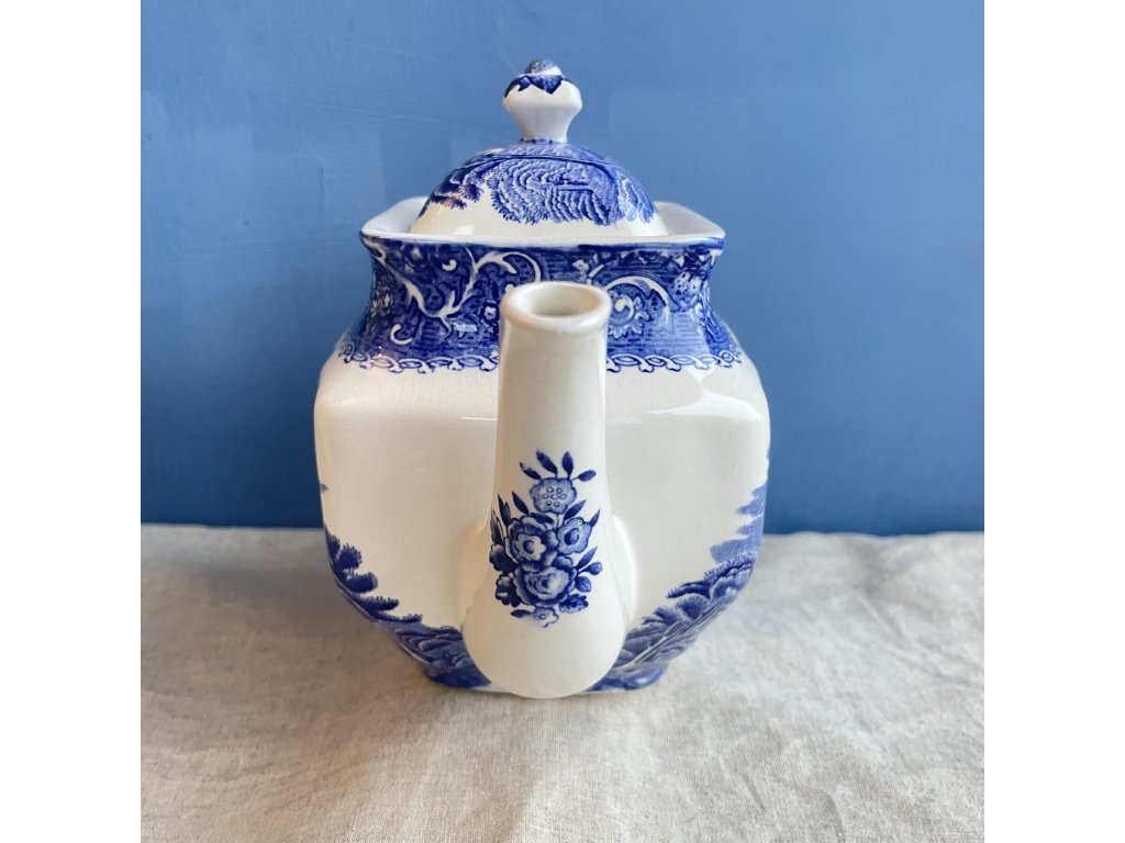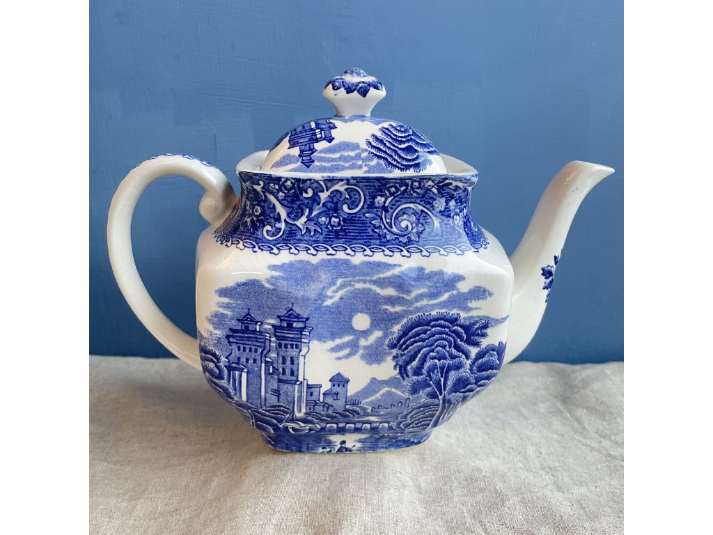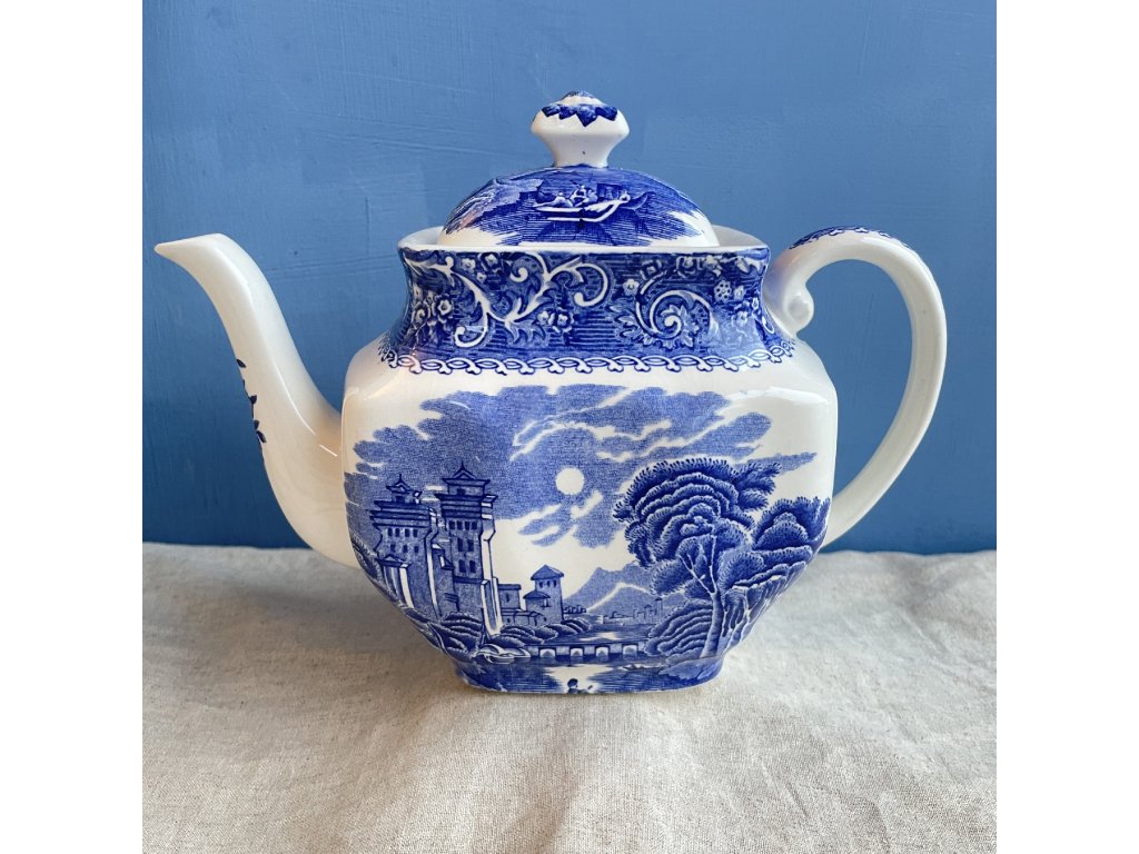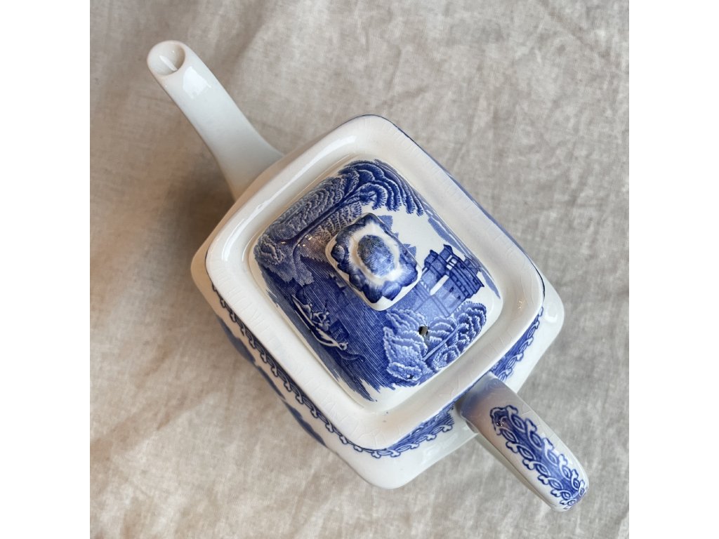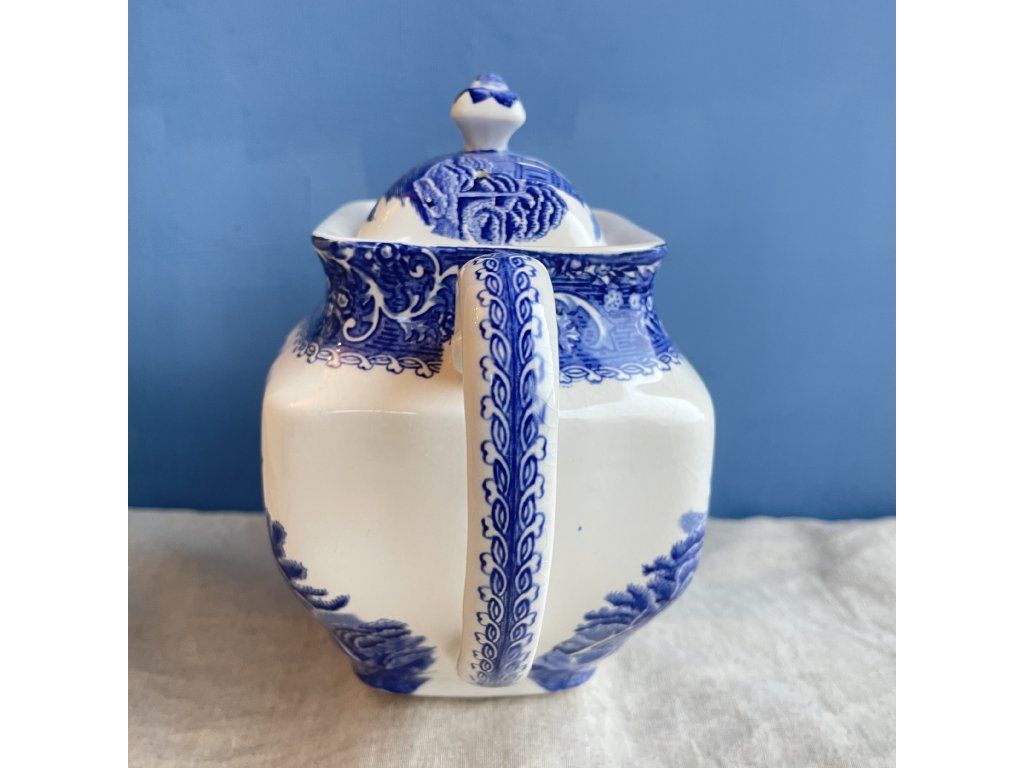 Porcelánová konvice je zdobena klasickým modrobílým krajinovým dekorem River Scene, typickým pro anglický přenosový tisk inspirovaný romantickými představami krajiny 18. a 19. století.