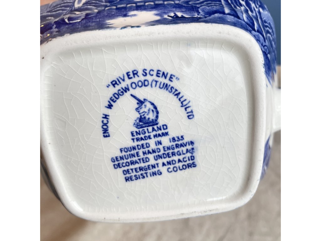 Výrobce Enoch Wedgwood (Tunstall) Ltd, England, doplněné názvem dekoru River Scene.
